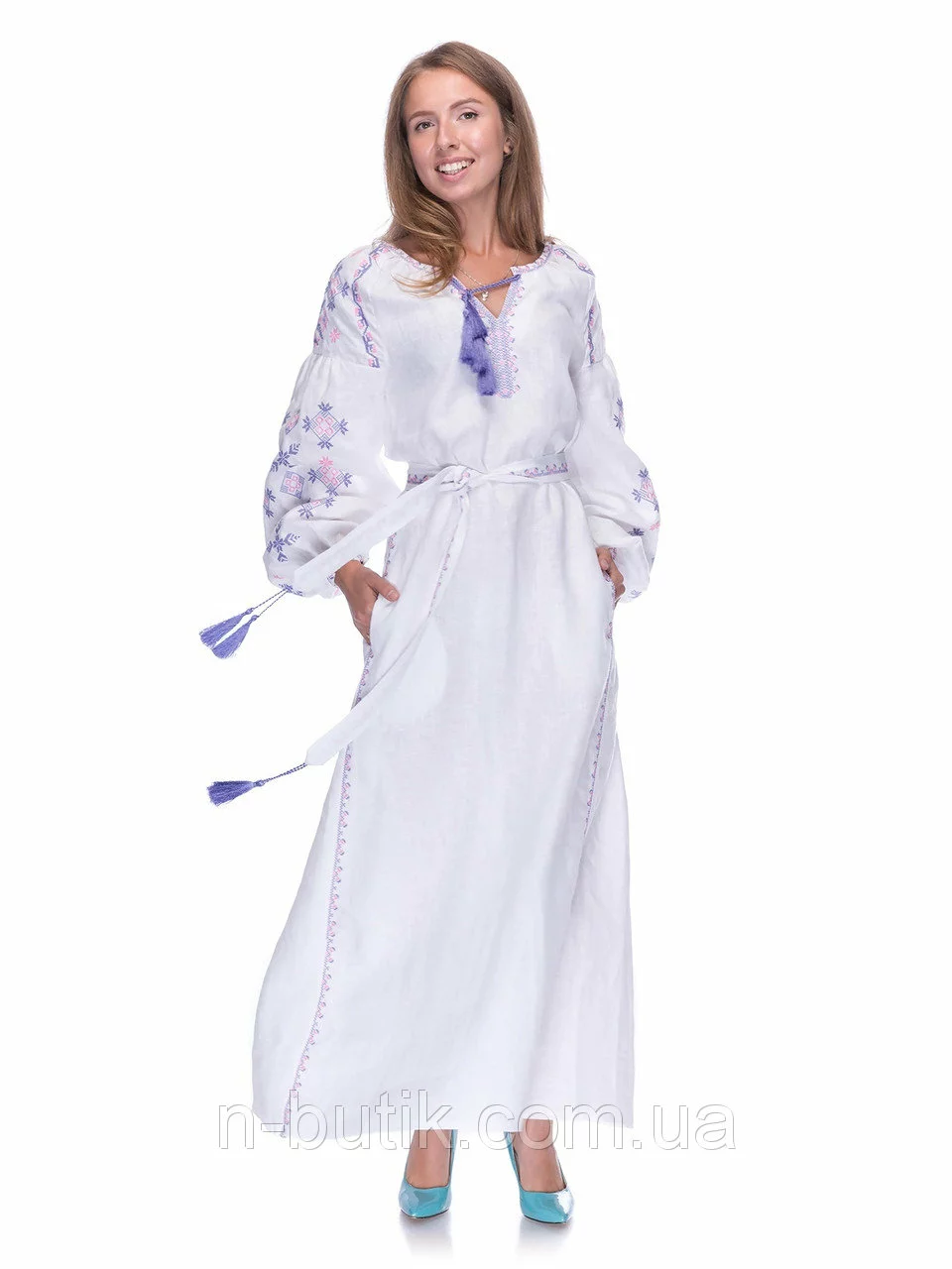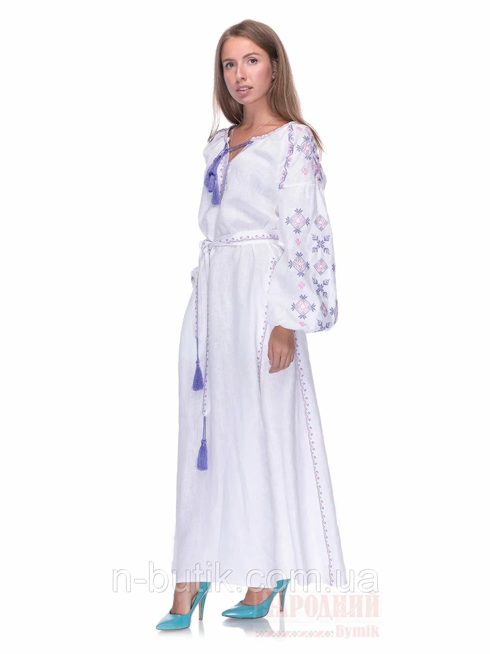 Белое длинное платье с вышивкой Цвет папороти