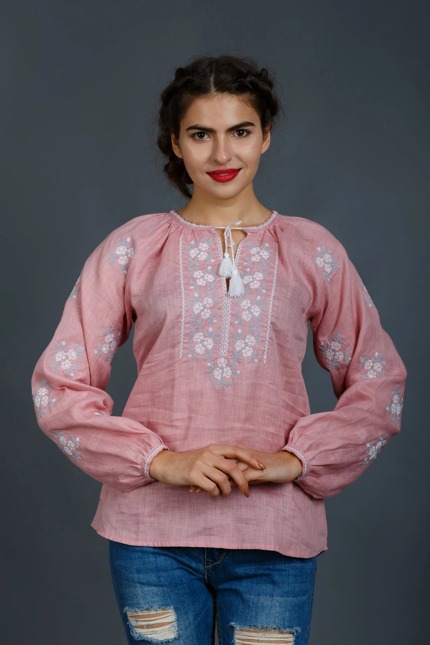 Удобная и стильная нежно-розовая вышиванка с бело-серой вышивкой в