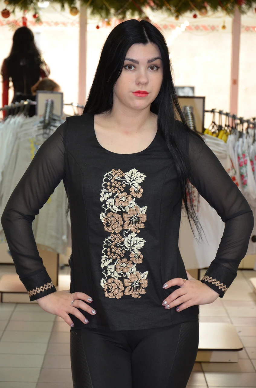 Черная женская вышиванка с гипюровым рукавом 44