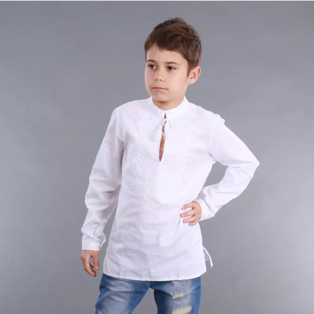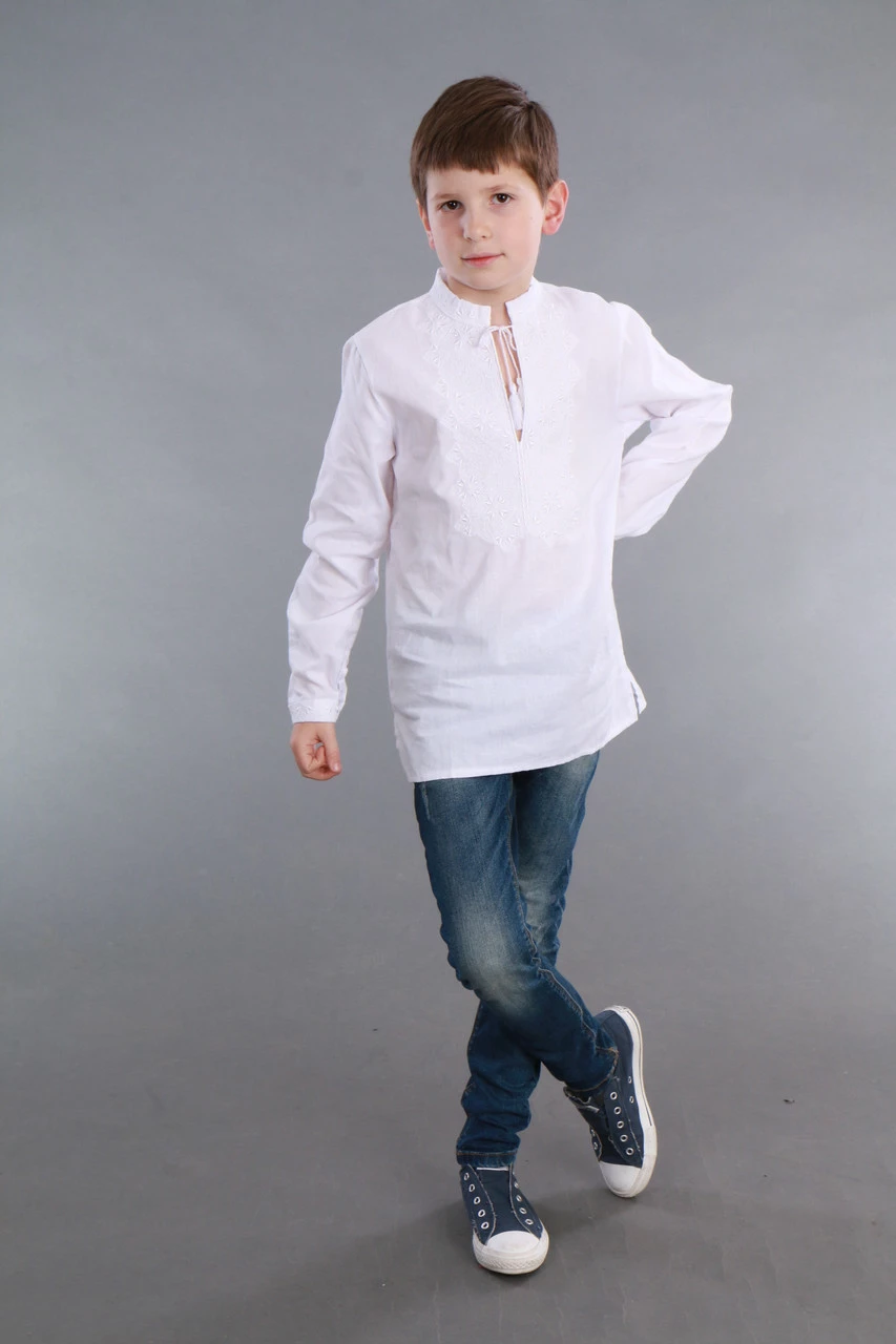 Белая детская вышиванка для мальчика с длинным рукавом вышита