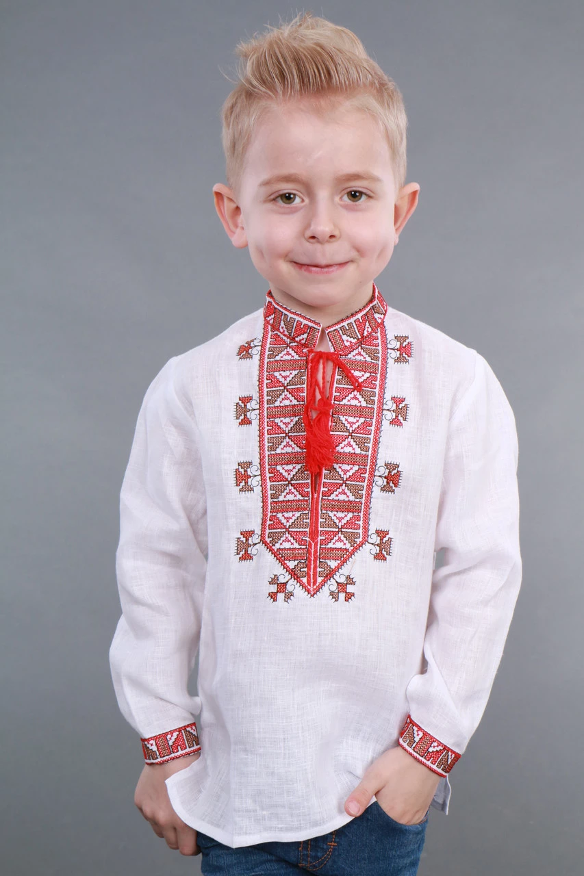 Детская вышиванка для мальчика "Гетьман" красный орнамент 104, лён
