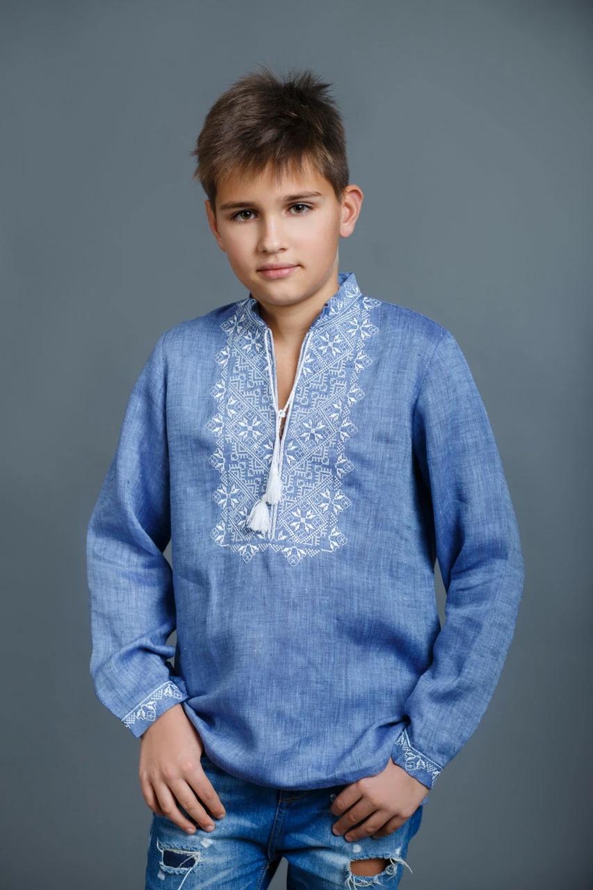 Детская вышиванка для мальчика, лен джинс, длинный рукав 98