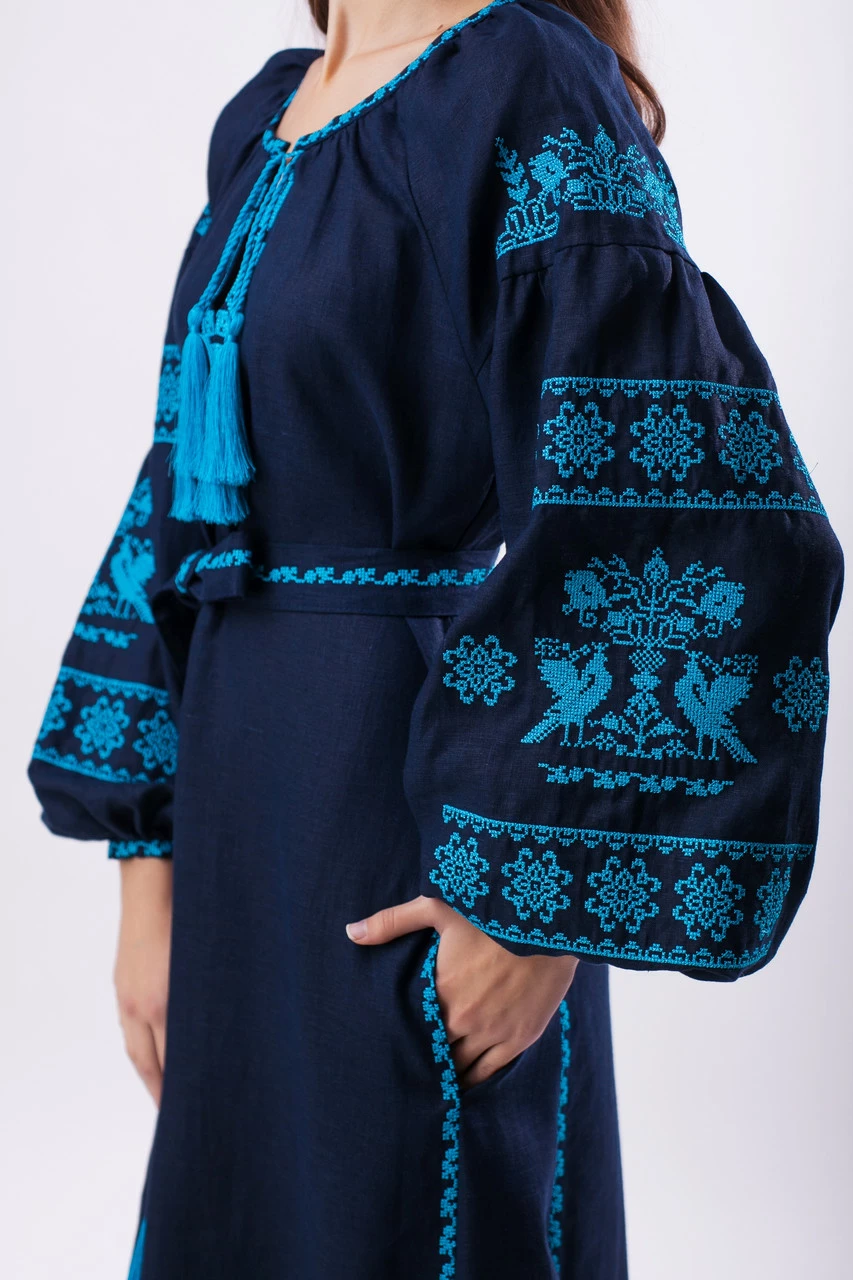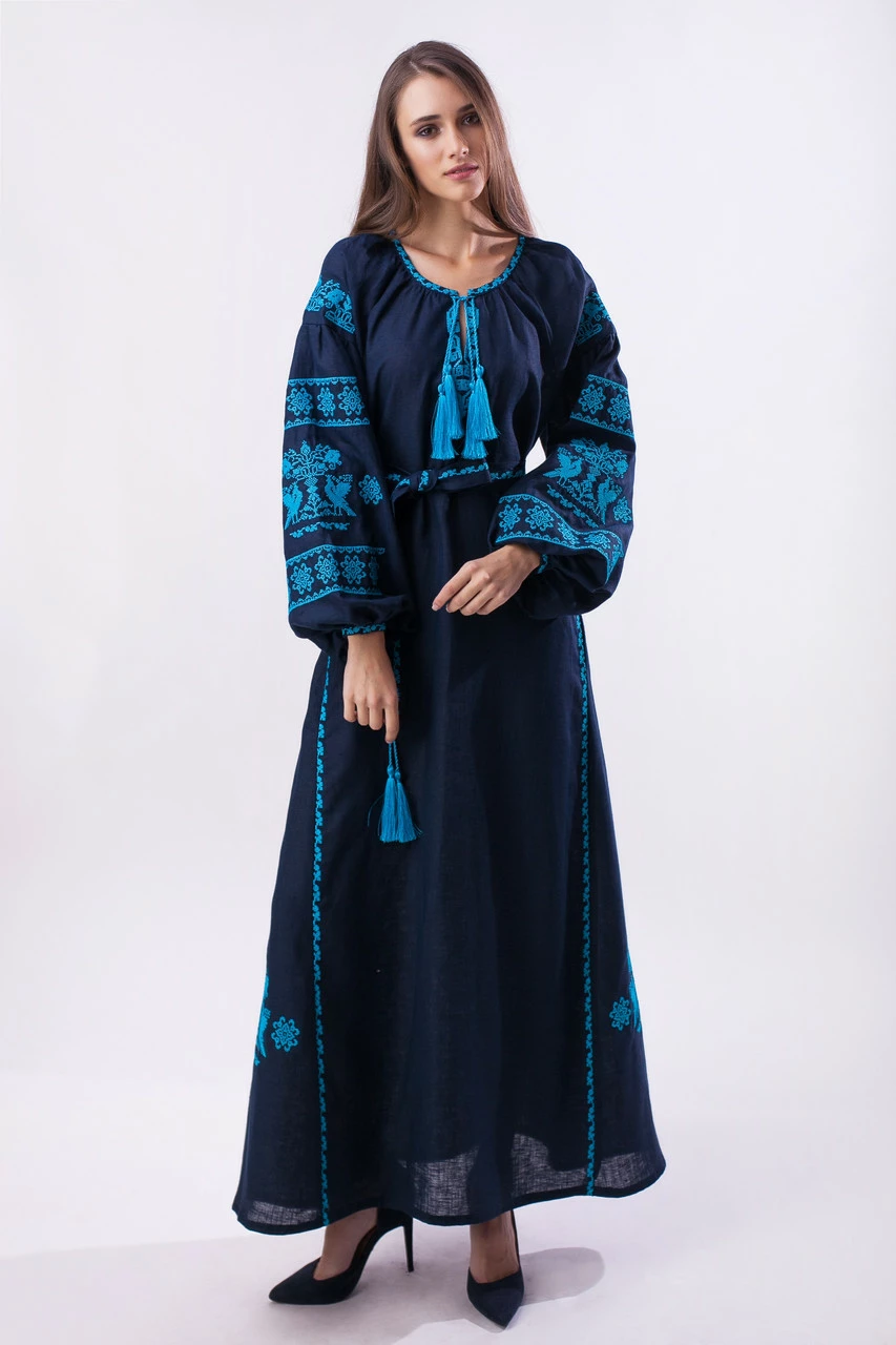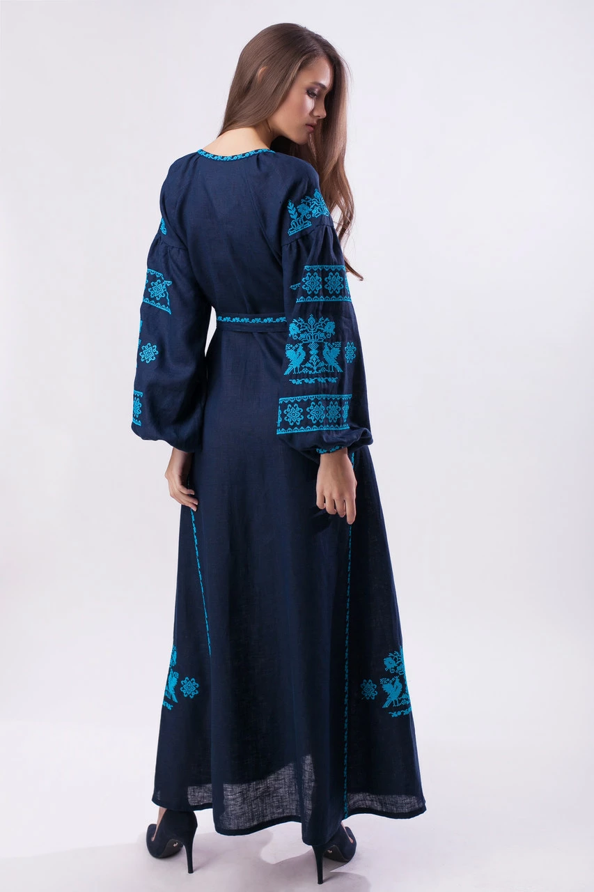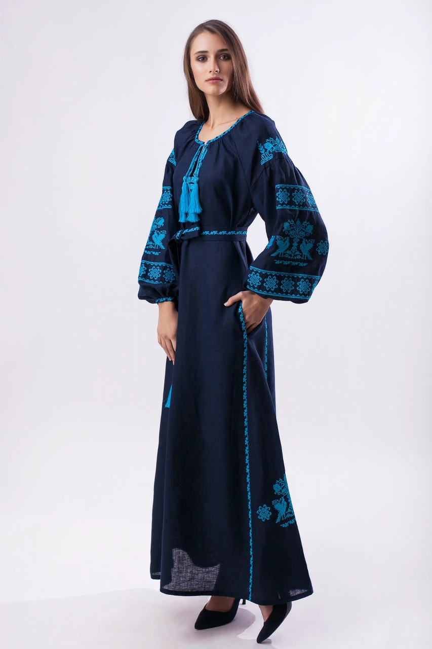 Платье длинное из темно - синего льна с вышивкой Волшебная птица