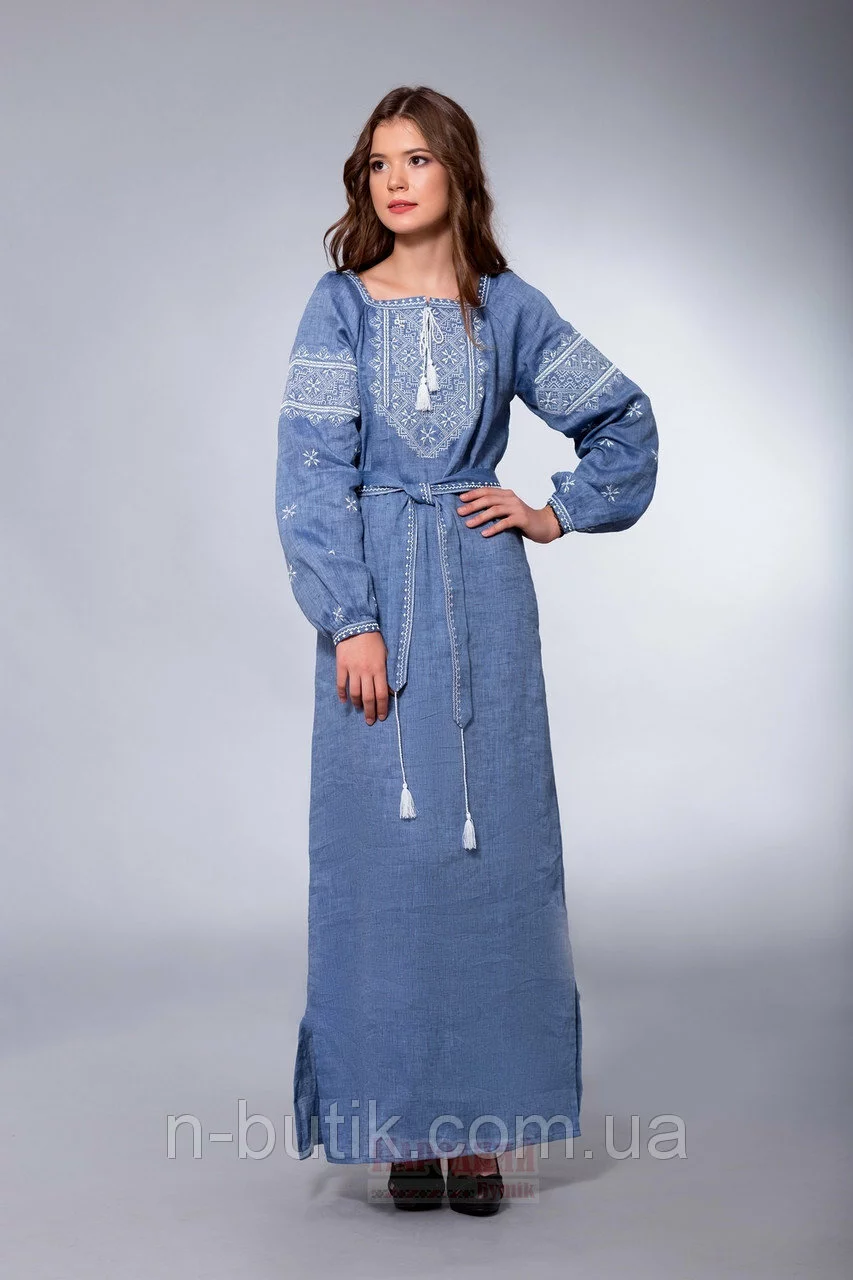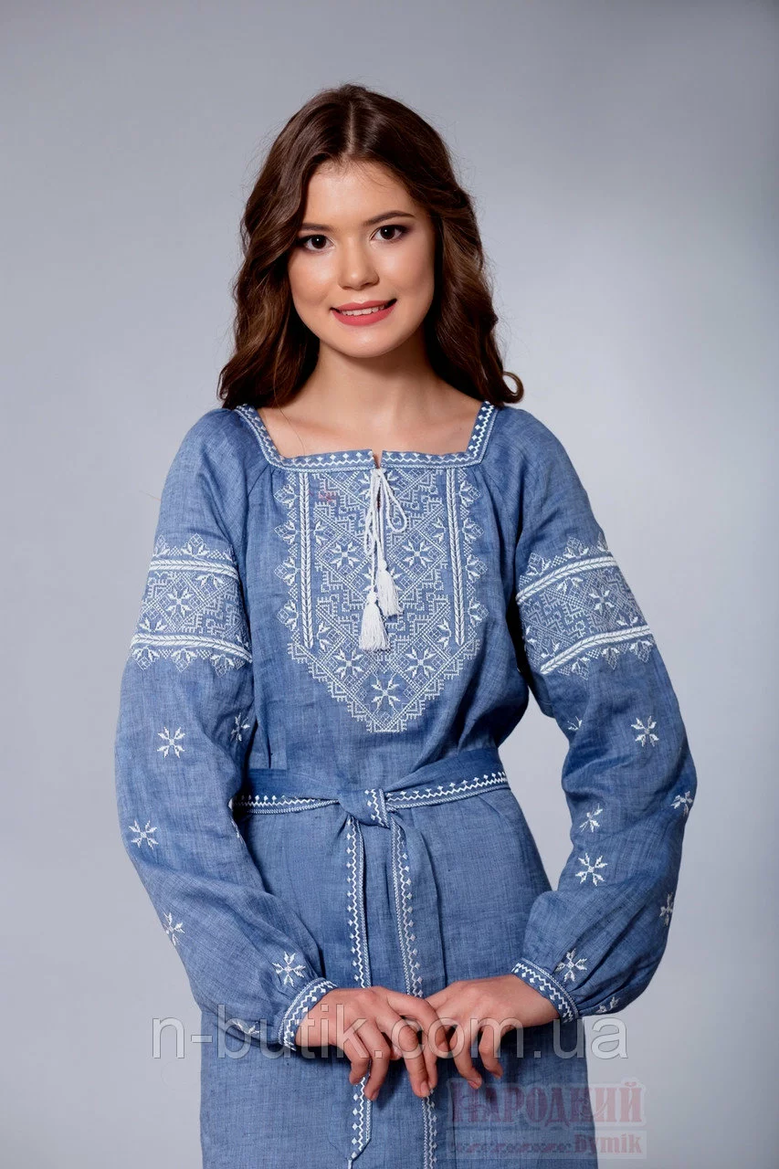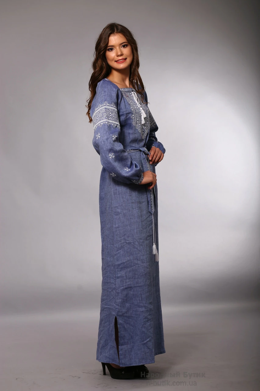 джинс. Длинные рукава платья вышиты узором по всей длине с не
