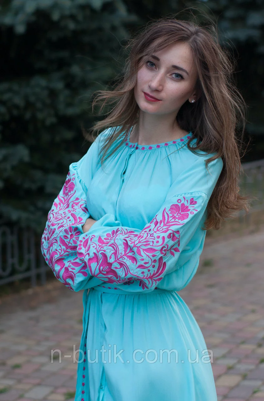 Длинное платье, цвета "мята" с вышивкой Дерево жизни