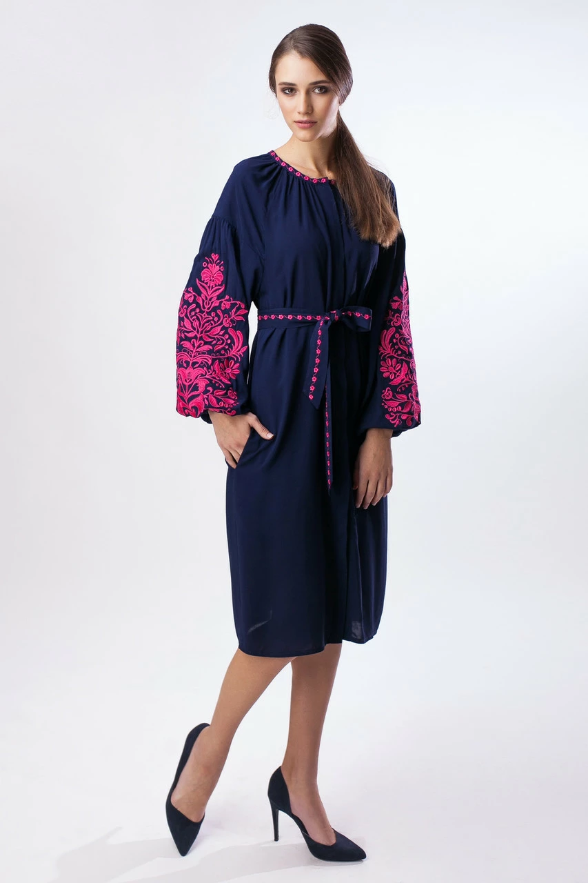 Короткое штапельное платье с розовой вышивкой Дерево жизни
