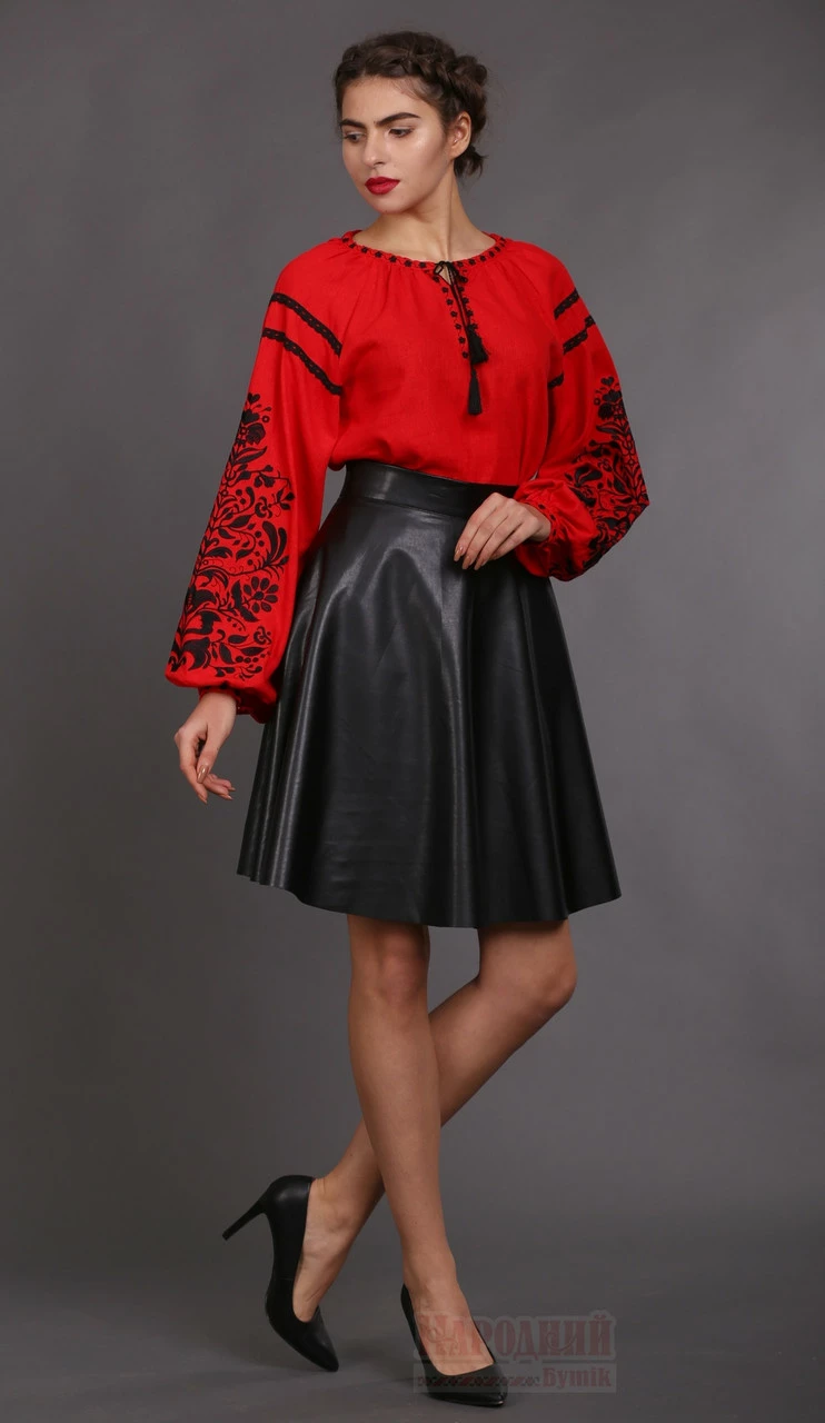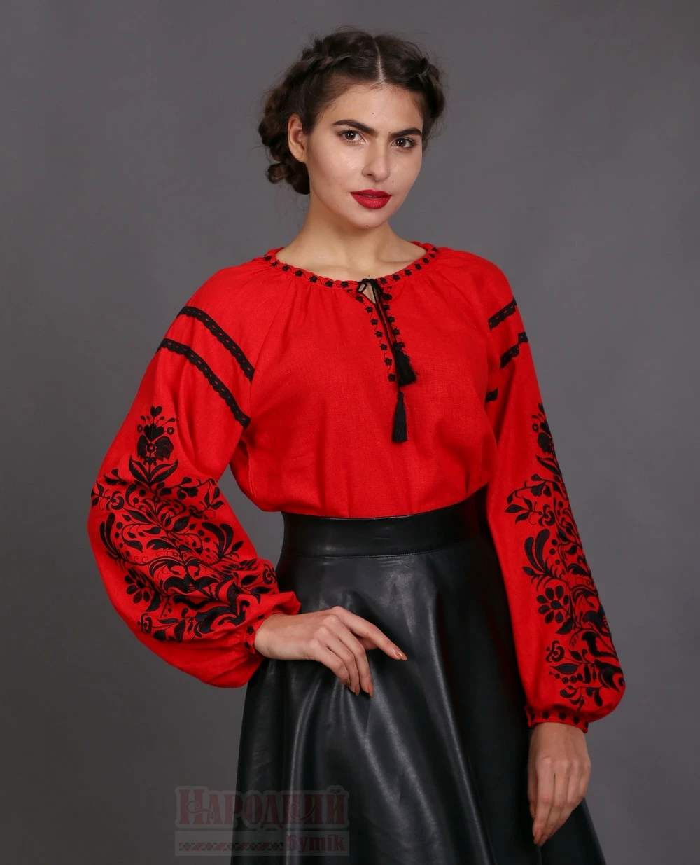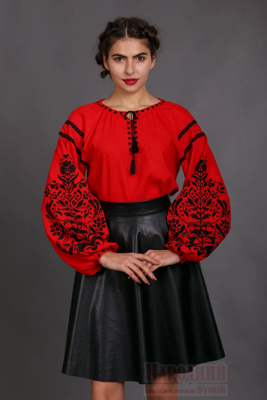 Красивая женская вышиванка из красного льна с узором "дерево жизни" - станет изюминкой вашего гардероба. Яркая красная ткань вышиванки вышита шелковистыми черными нитками. Узор украшает пышные рукава изделия и смотрится объемно и богато.