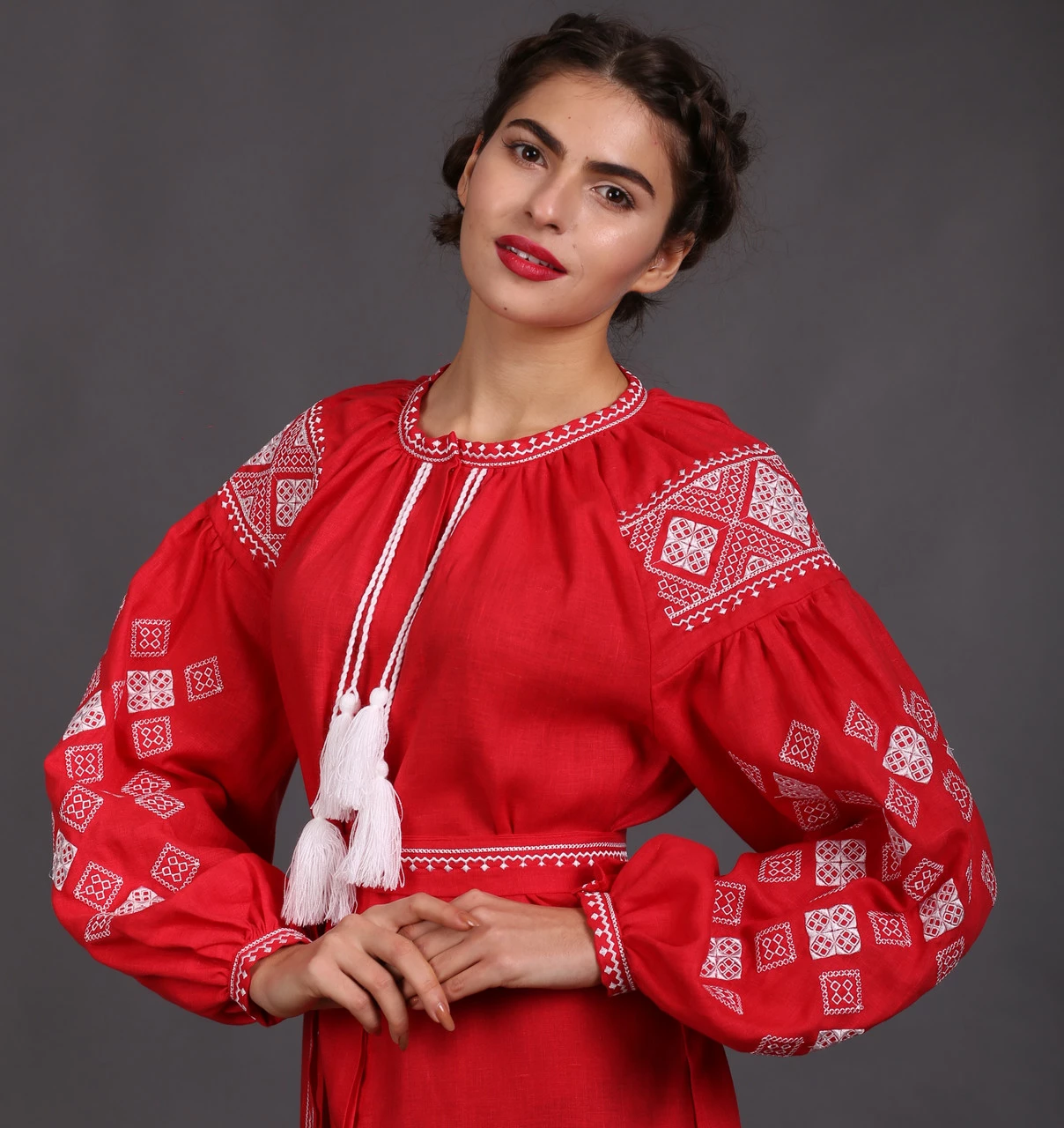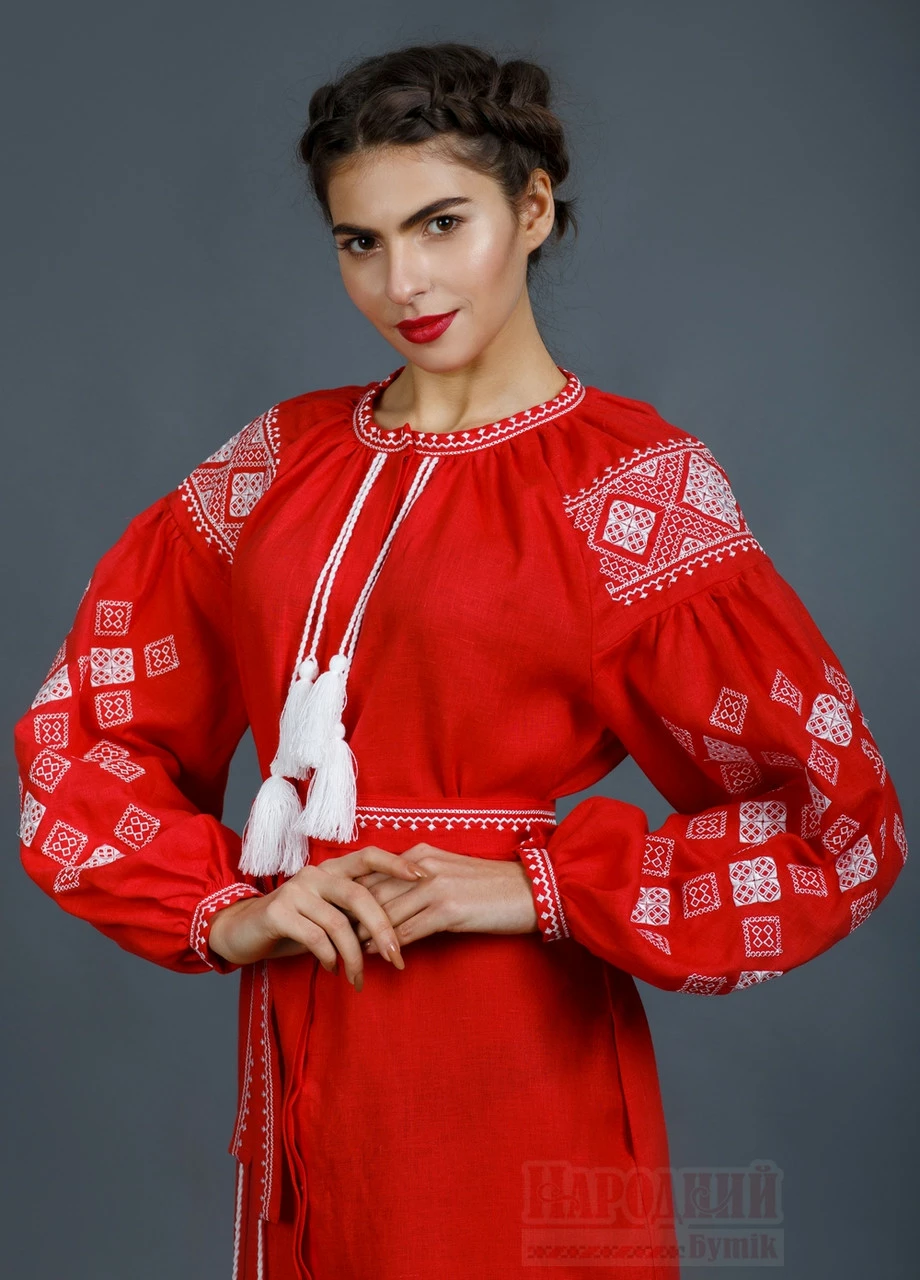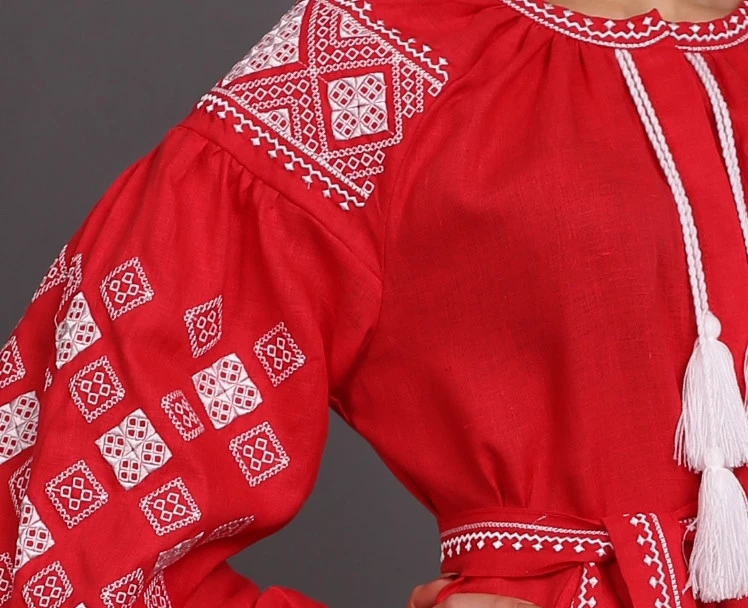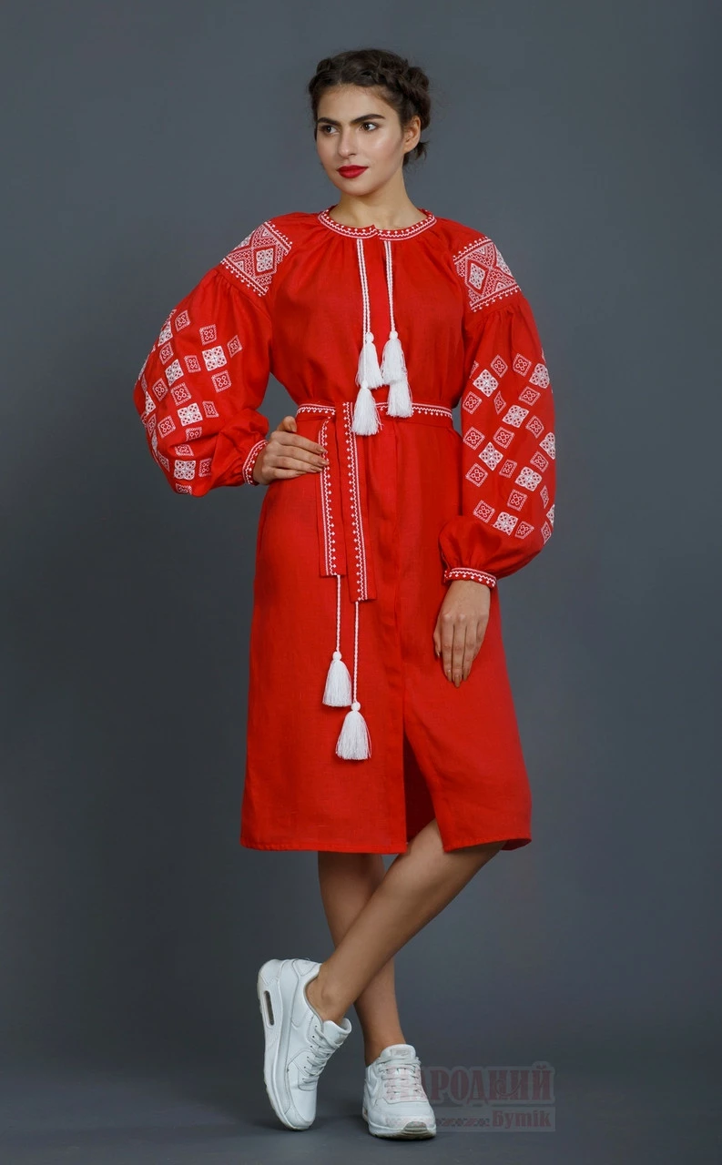 Красное вышитое средней длины с пышным рукавом пошито из 100 %