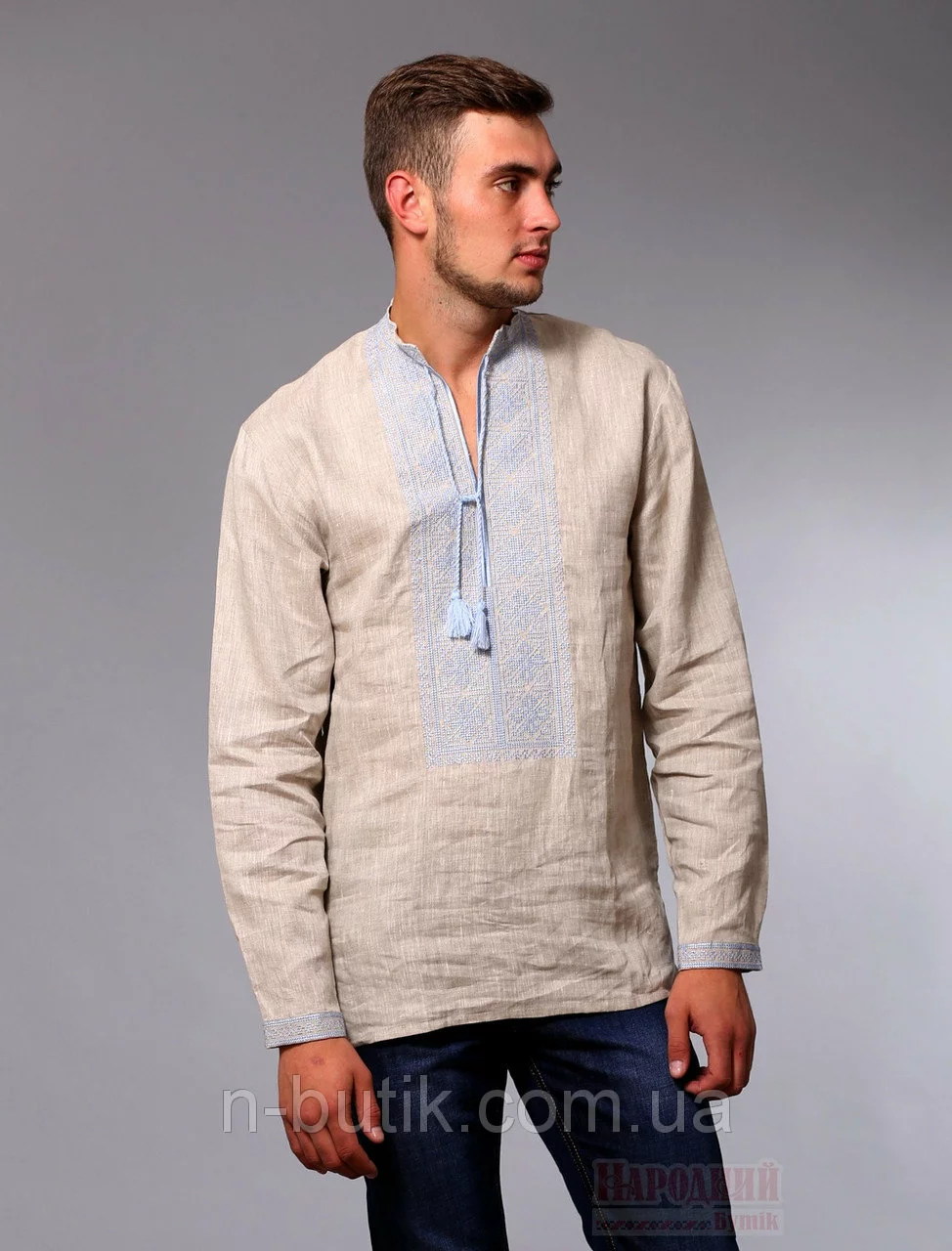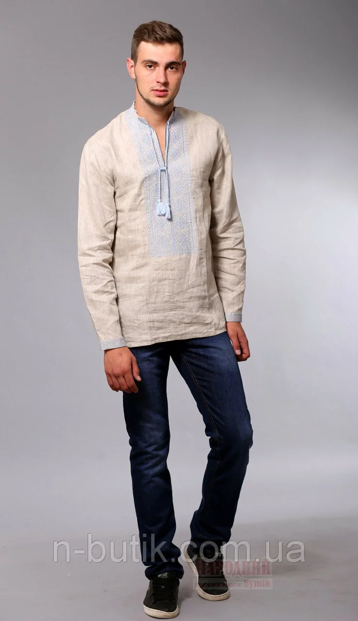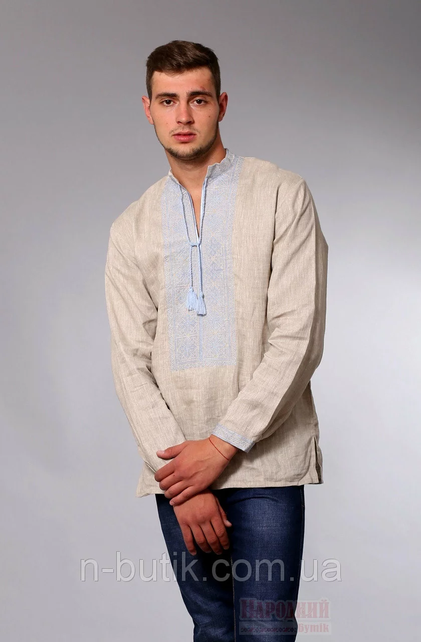Мужская рубашка вышиванка бежевого цвета с голубой вышивкой