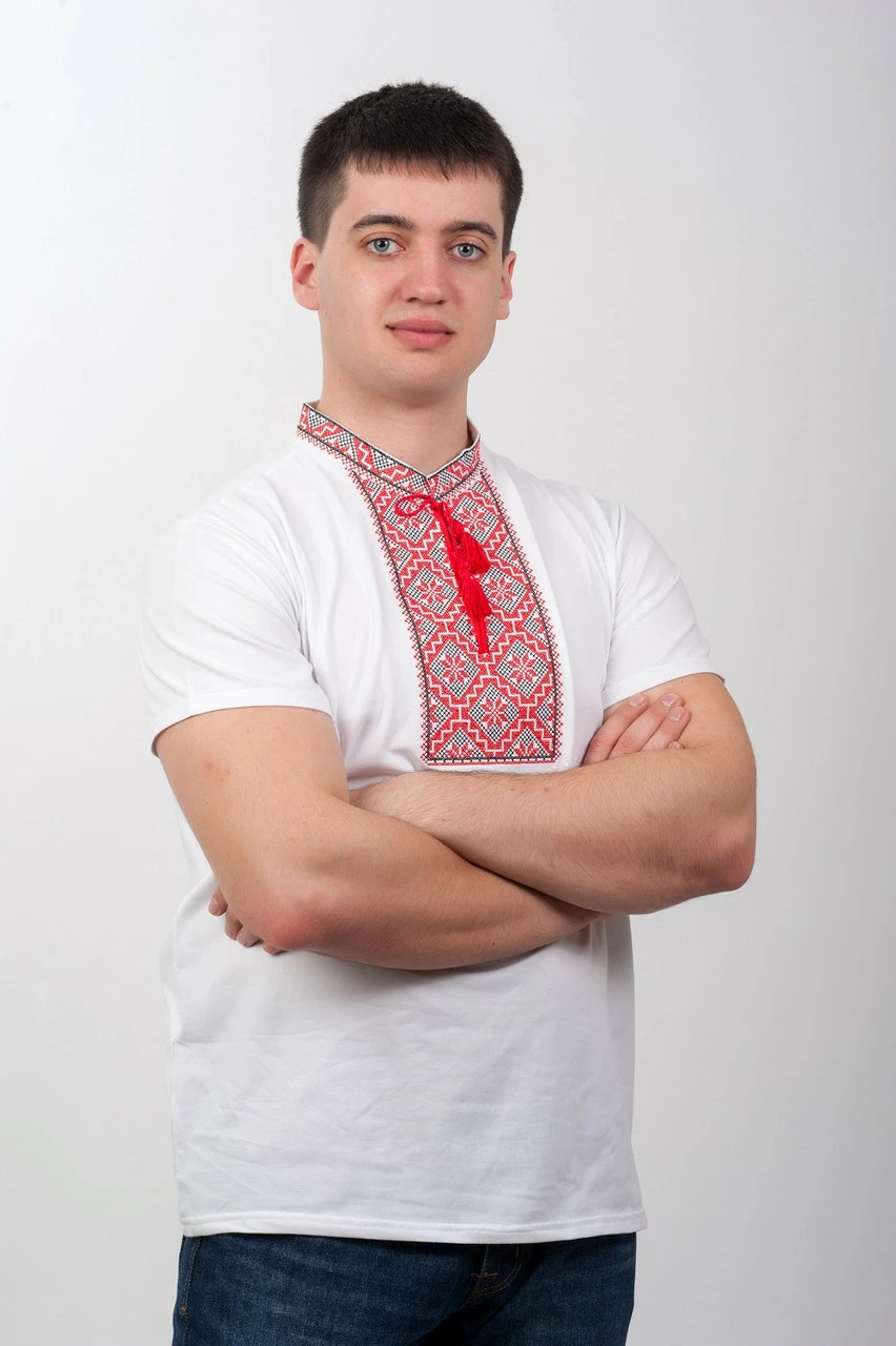 Белая мужская вышитая футболка с орнаментом в красно-черных