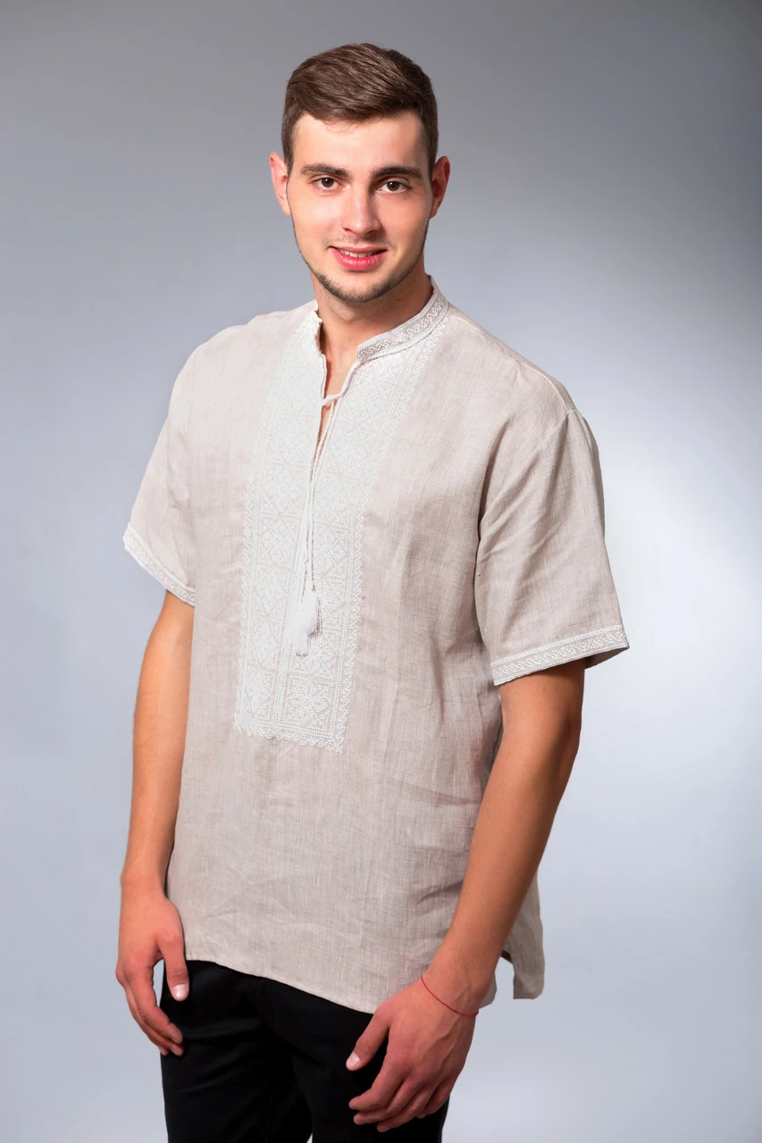Мужская вышитая сорочка с коротким рукавом, бежевый лен 42