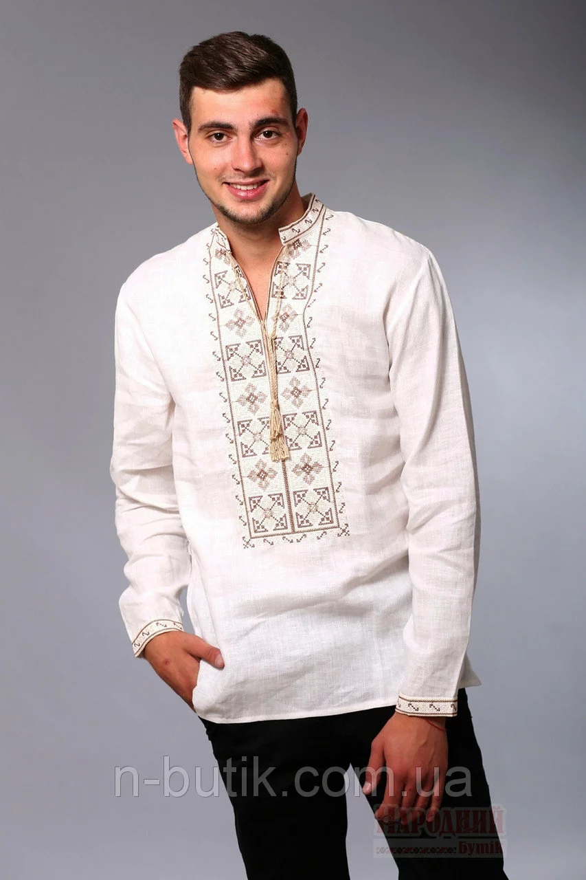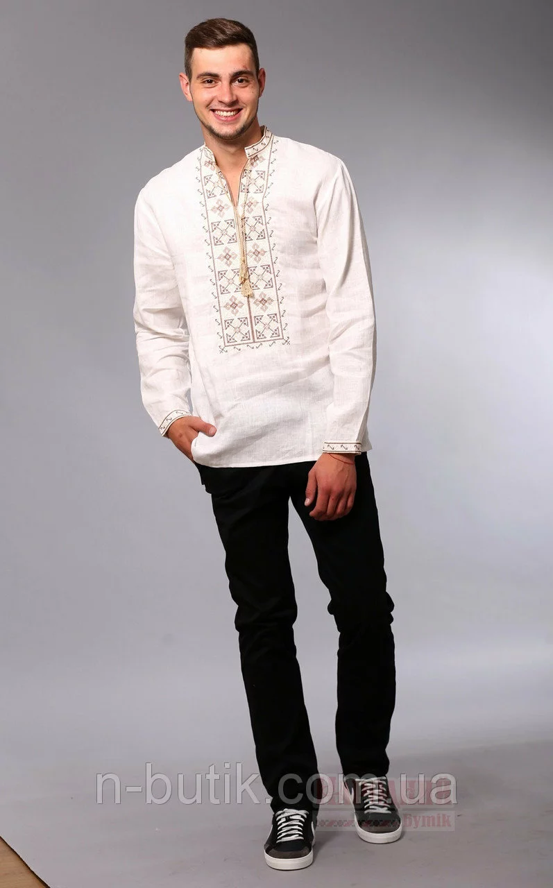 Вышиванка простого классического кроя, с длинными рукавами. Орнамент вышит нитками в бежевых тонах.