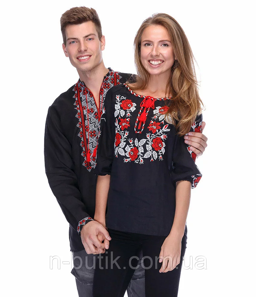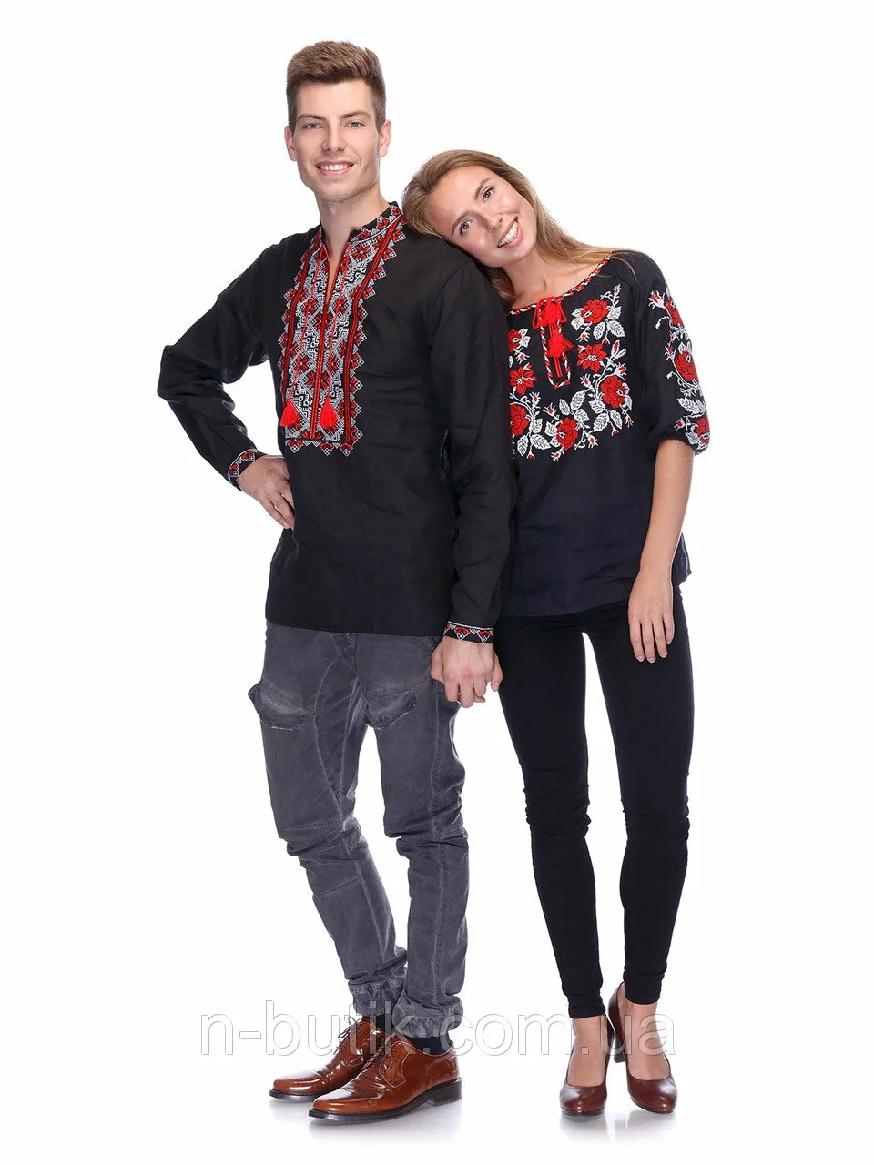 Парные вышиванки из черного льна с красно - черной вышивкой