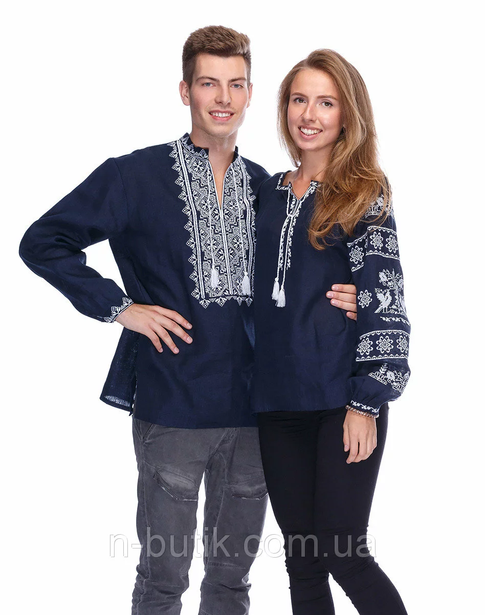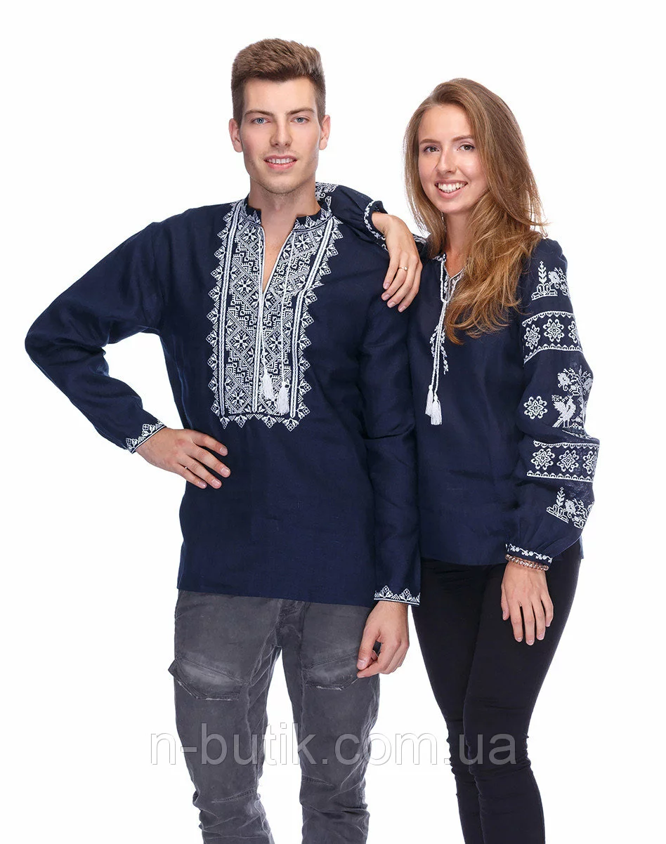 Парные вышиванки из синего льна (белая вышивка)