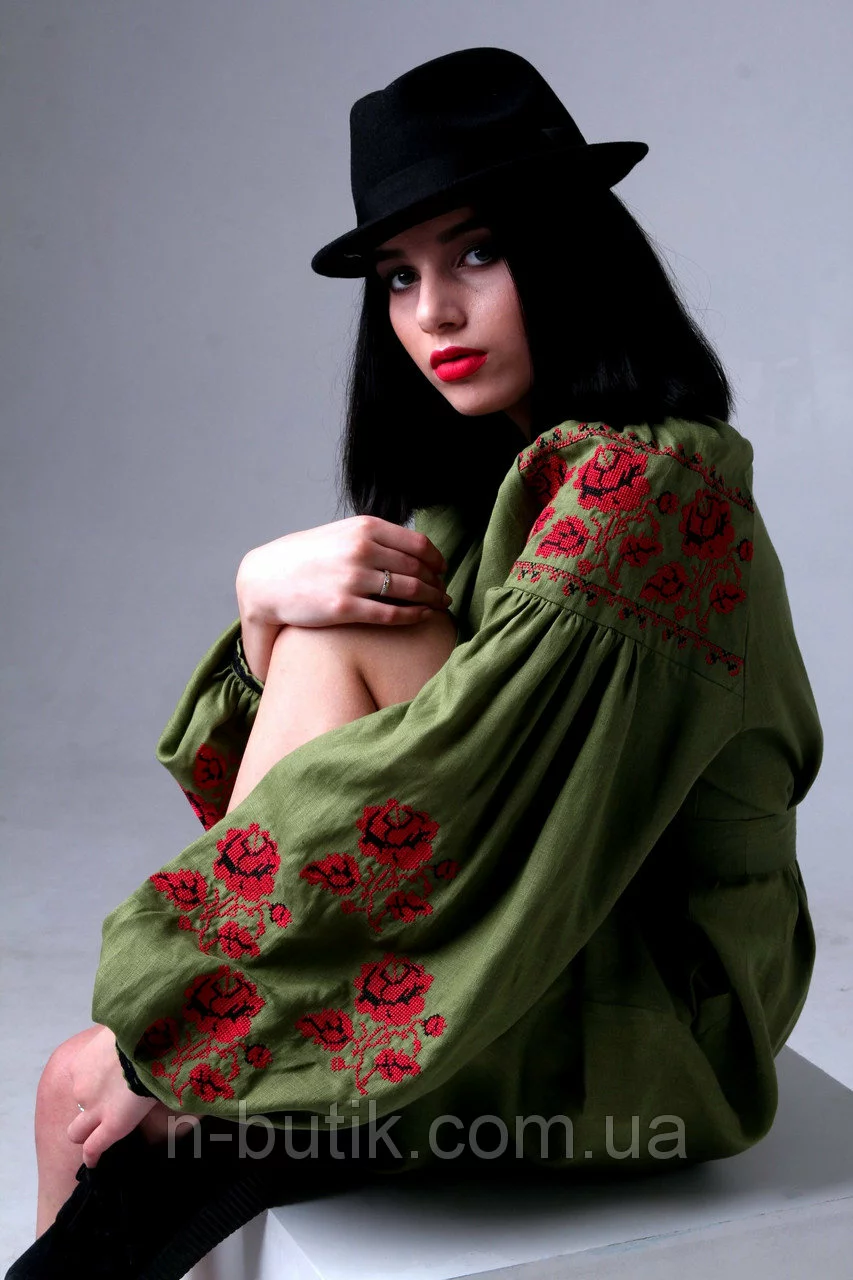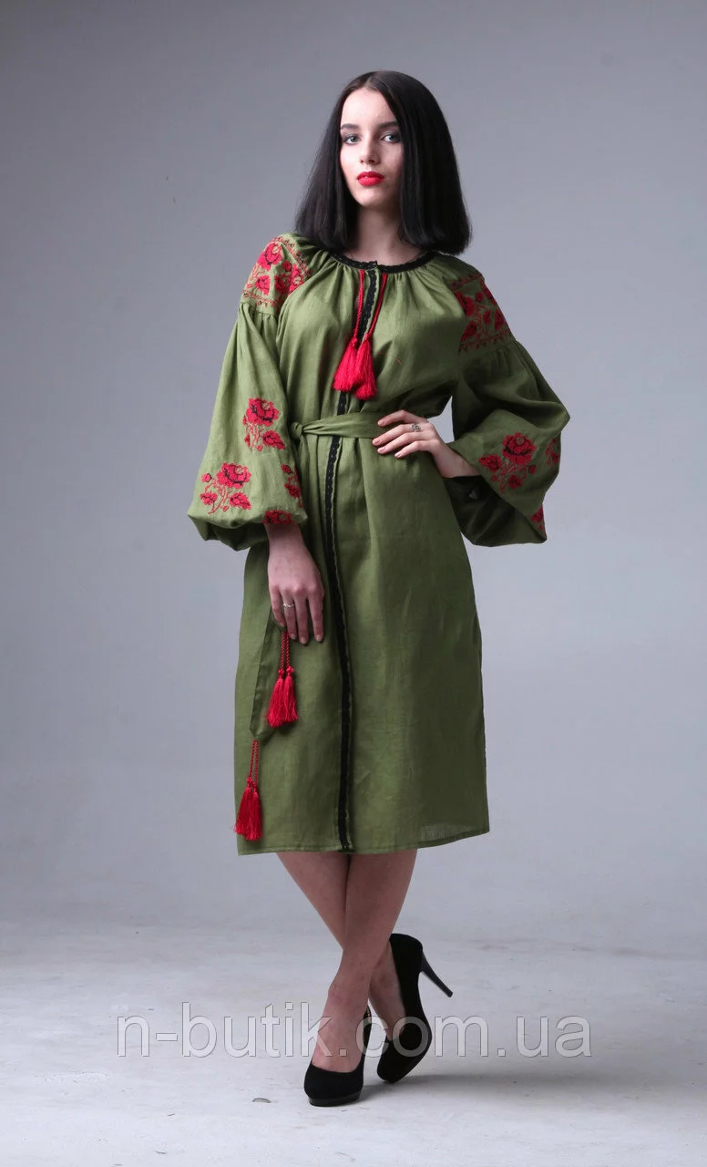 Красивое платье из оливкового льна с вышивкой