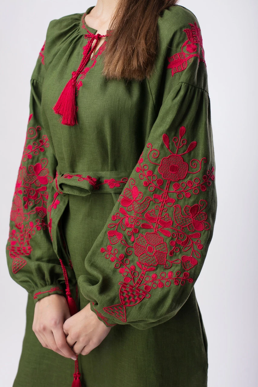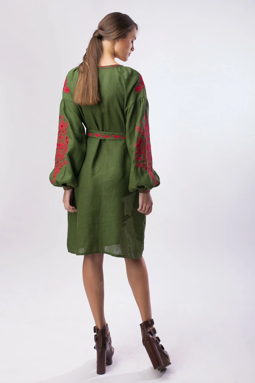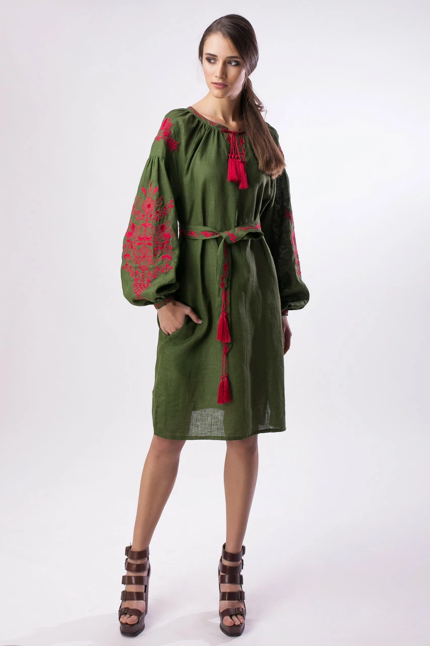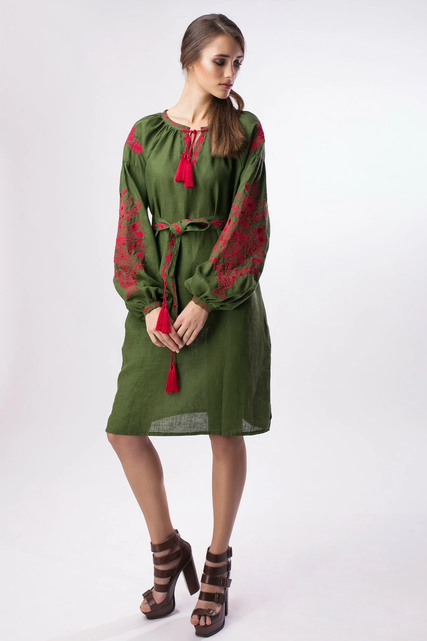 Элегантное платье из льна цвета "хаки" с контрастной яркой вышивкой