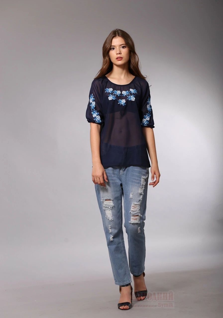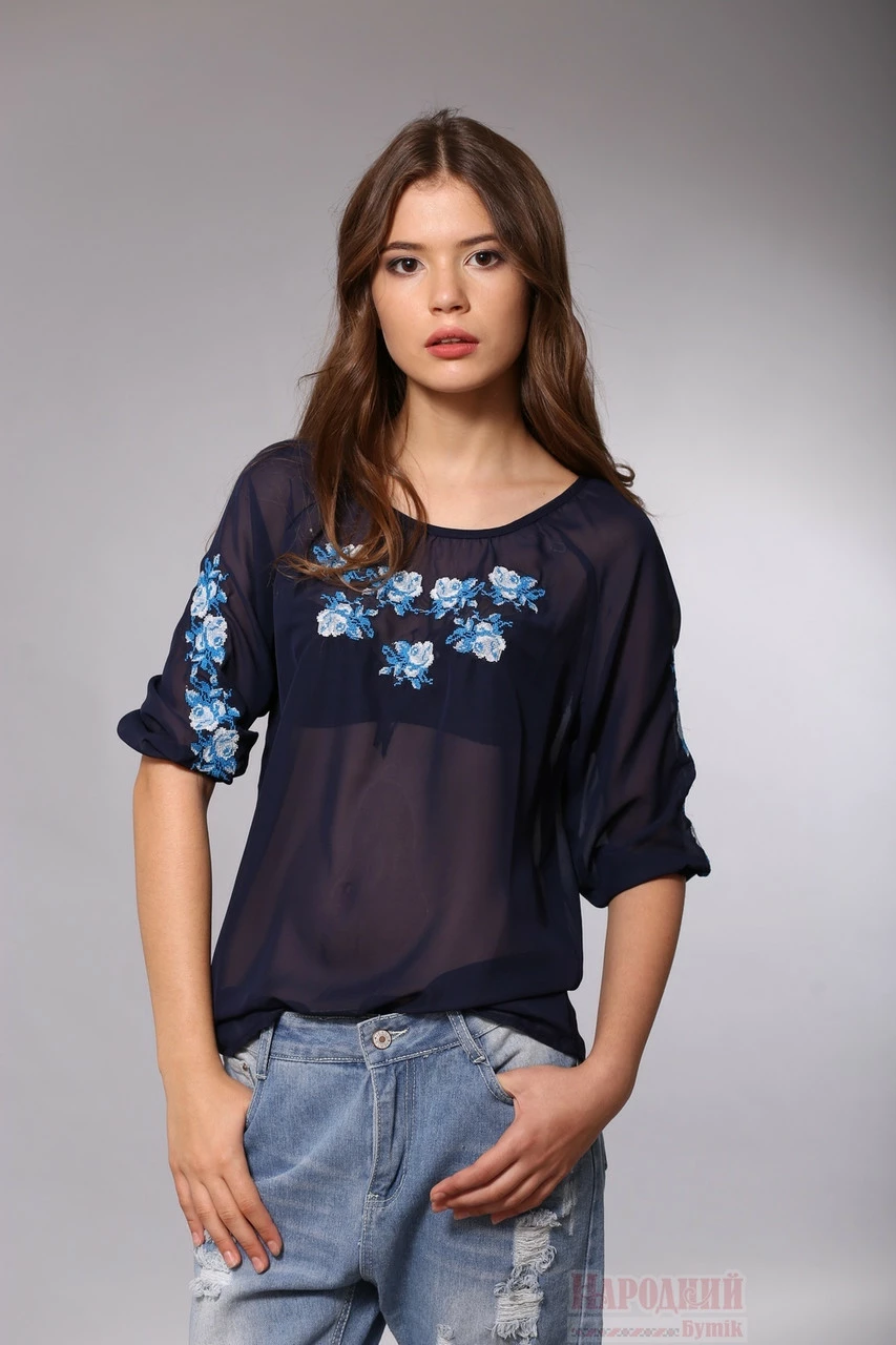 Блузка из темно - синего шифона с голубой вышивкой в виде роз с листочками.