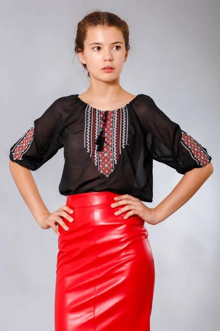Черная шифоновая блуза с геометрическим орнаментом вышитым на груди и рукавах изделия.