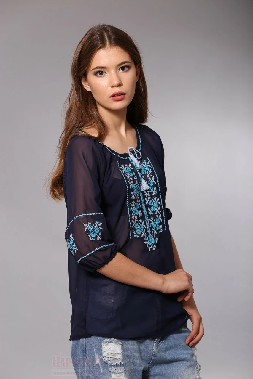 из синего шифона украшена узором из мелких розочек. Узор исполнен голубых и бирюзовых тонах.
