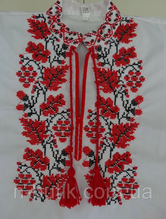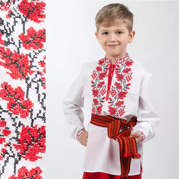 Хлопковая сорочка для мальчика с богатой вышивкой в виде дубовых листьев и желудей в красно черных тонах смотрится нарядно и оригинально.