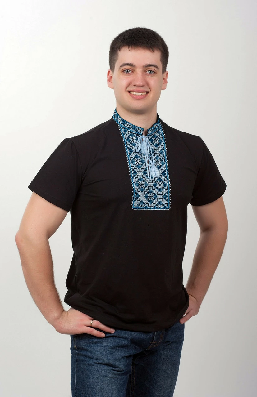 Стильная черная футболка с вышивкой в сине-голубых тонах