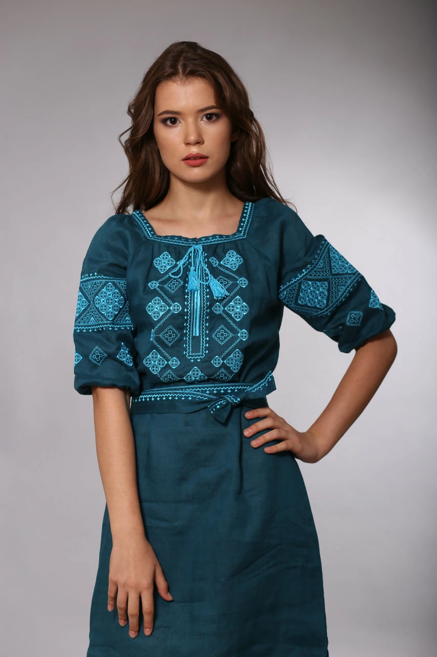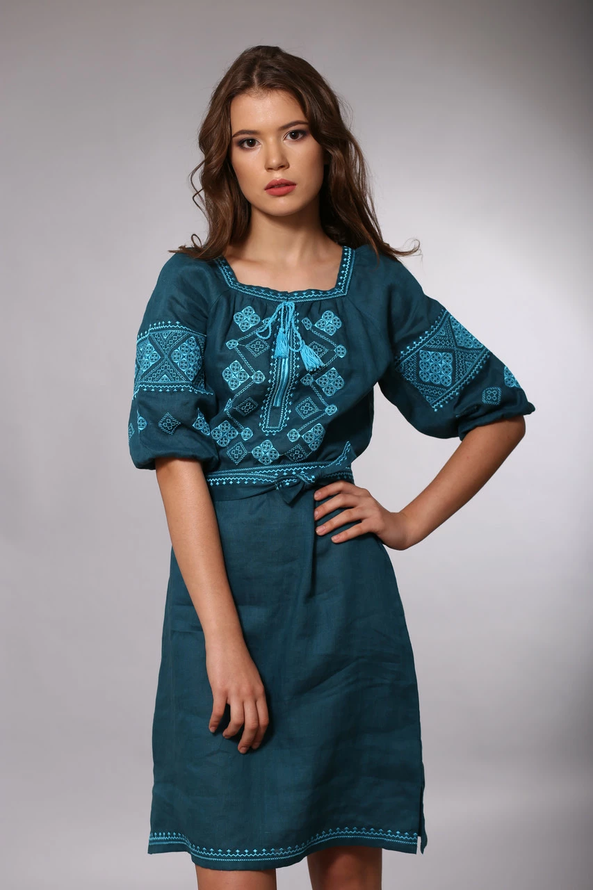 Платье цвета морской волны украшено бирюзовой вышивкой "Окошки" на