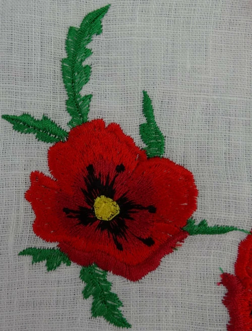 вышивка гладью в виде ярких красных маков присутствует на груди и