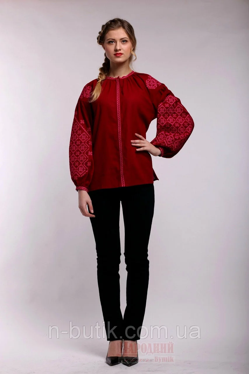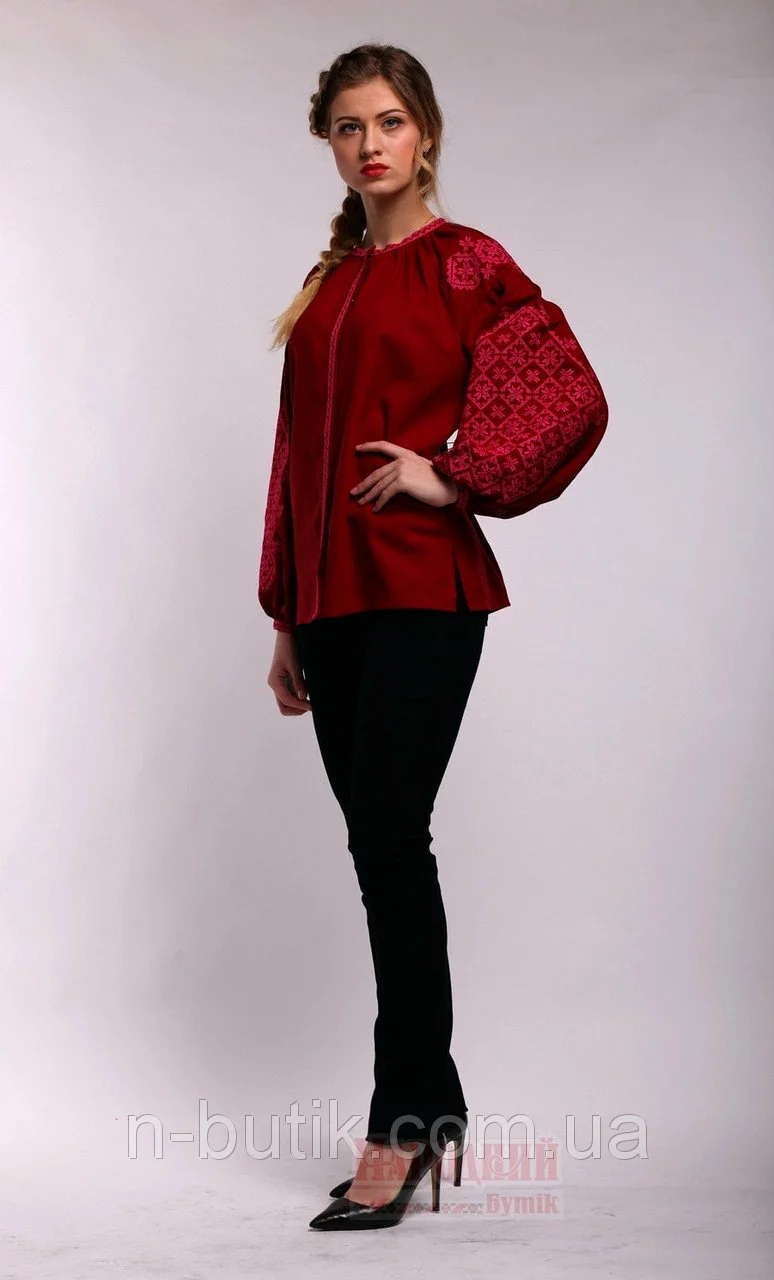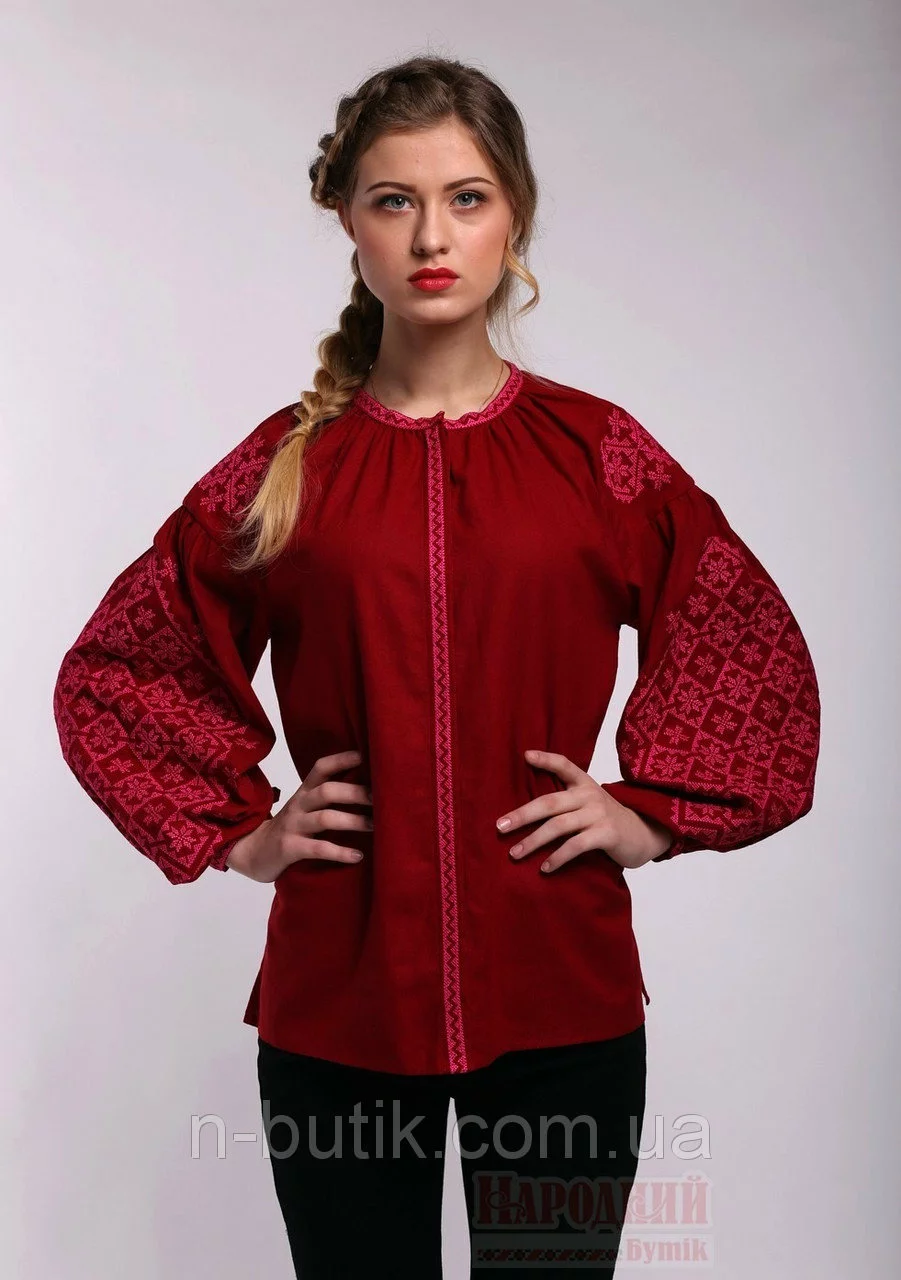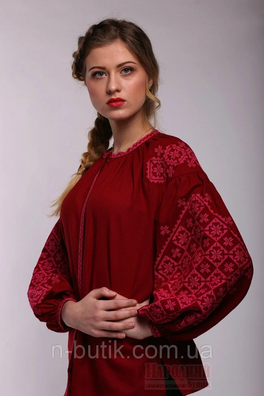 Вышиванка женская с пышным рукавом Ясные зори, бордовый лен
