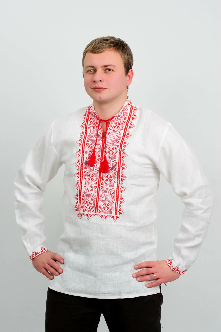 Модель 2004 Вышиванка муж белый лен, красная вышивка