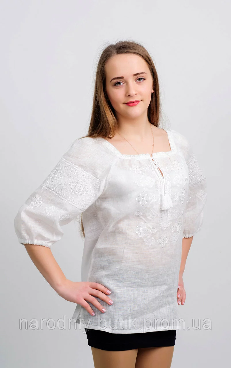 Вышиванка Окошко из натурального льна с нежной белоснежной вышивкой гладью для любительниц элегантного стиля.