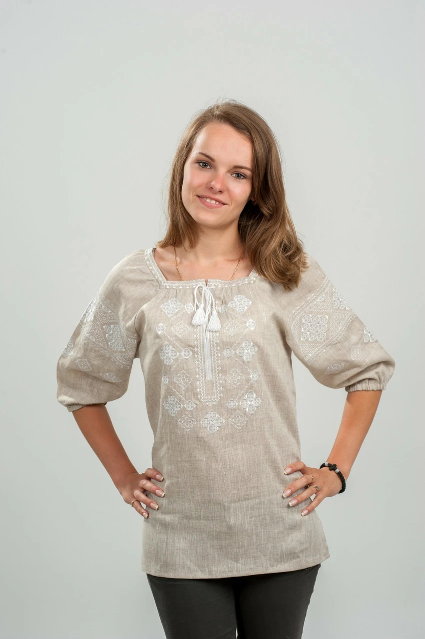 отбеленного(серого) льна и украшена нежным узором в белом цвете.
