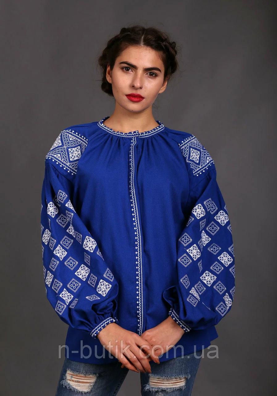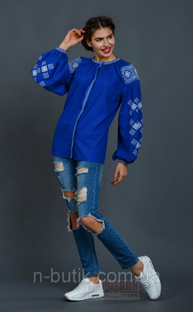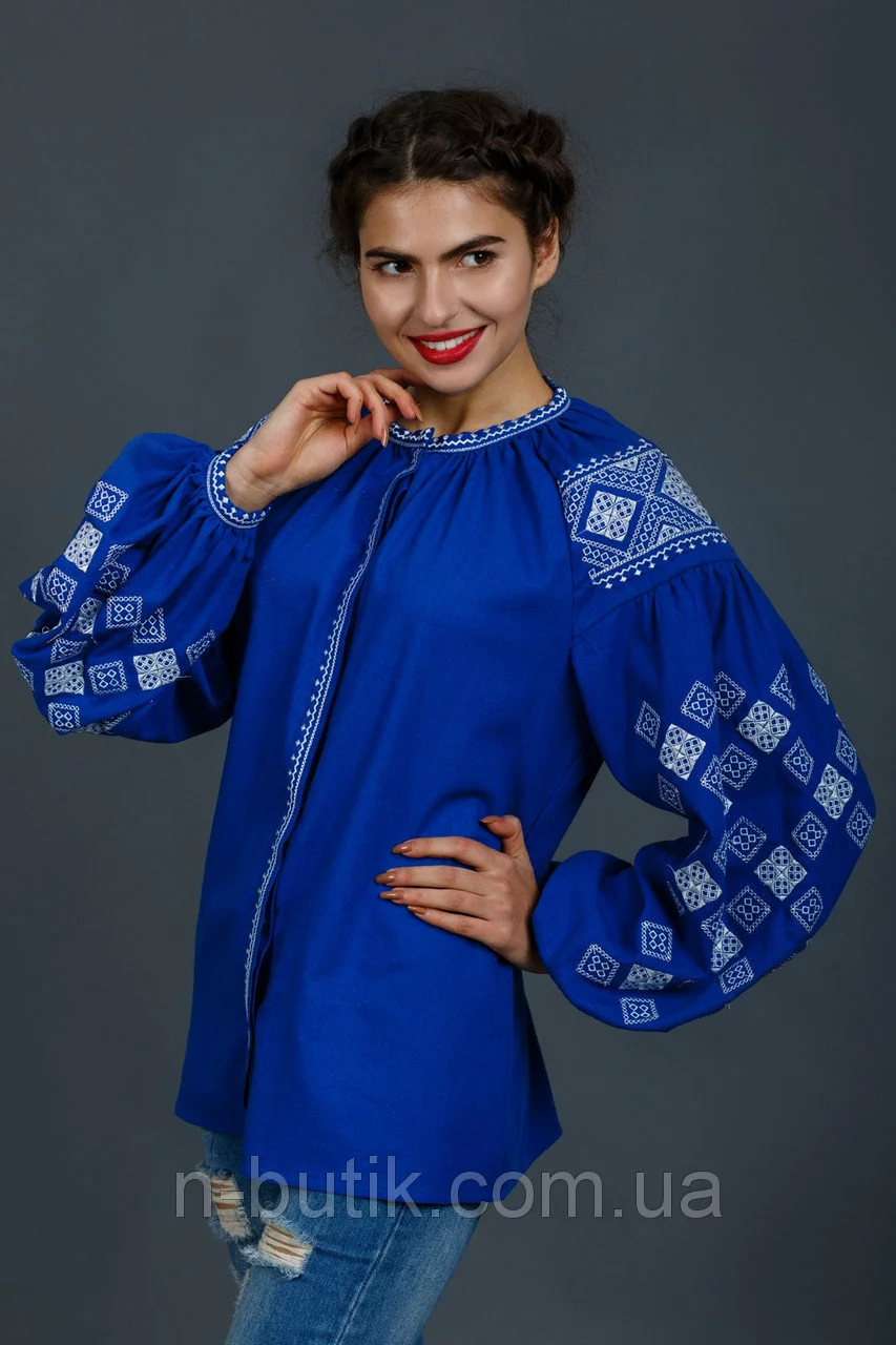 Вышиванка женская Окошечко, синий лен, белая вышивка