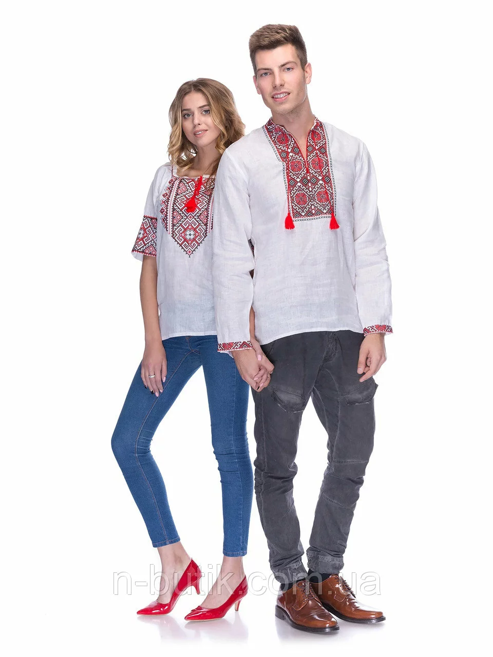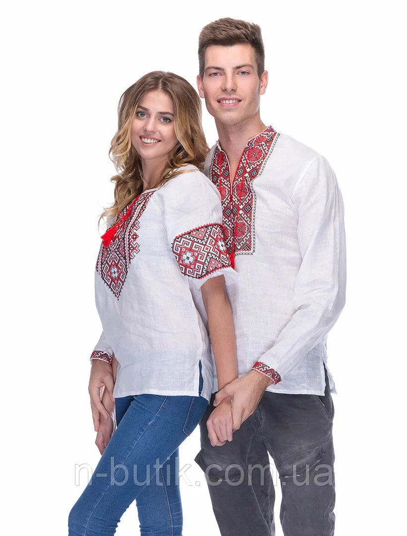 Вышиванки для пары из белого льна с красно - чоронй вышивкой
