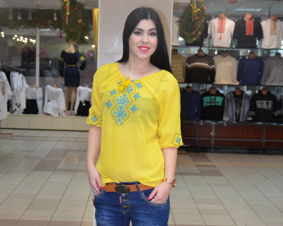 Женская вышиванка из желтого шифона с голубым орнаментом