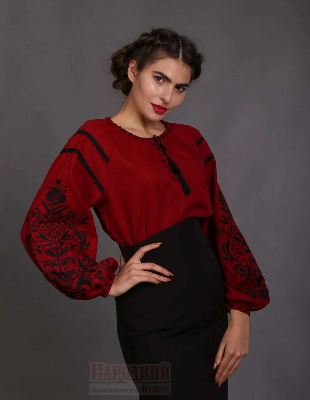 Женская вышиванка Дерево жизни, бордовый лен 42