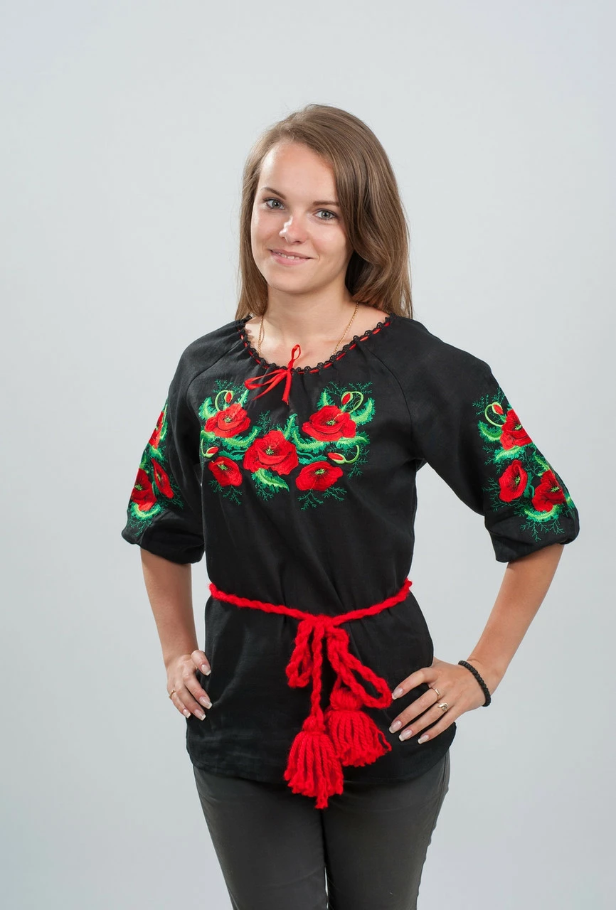 Вышиванка из черного льна с красными маками