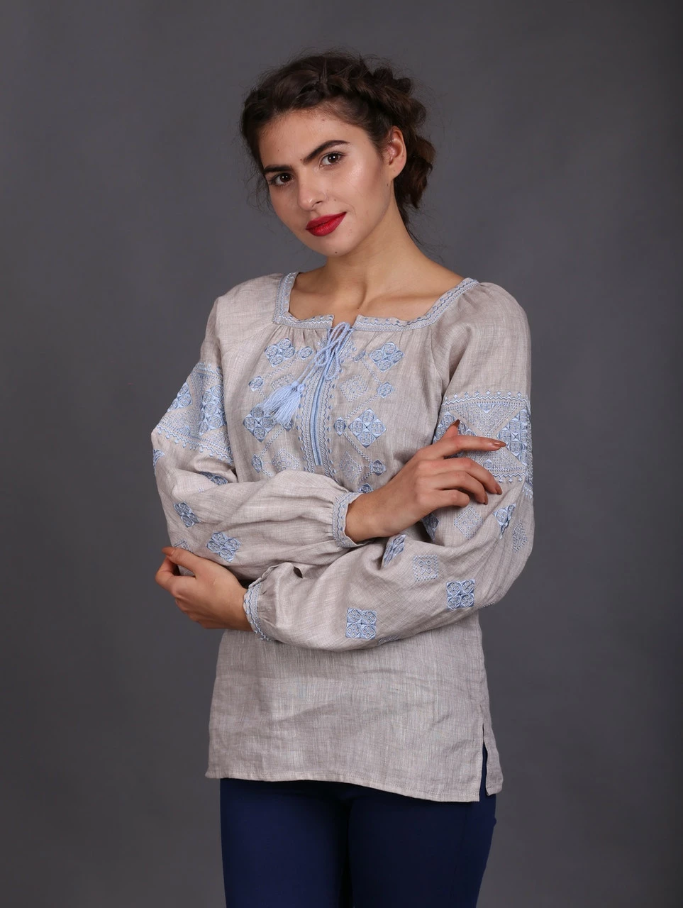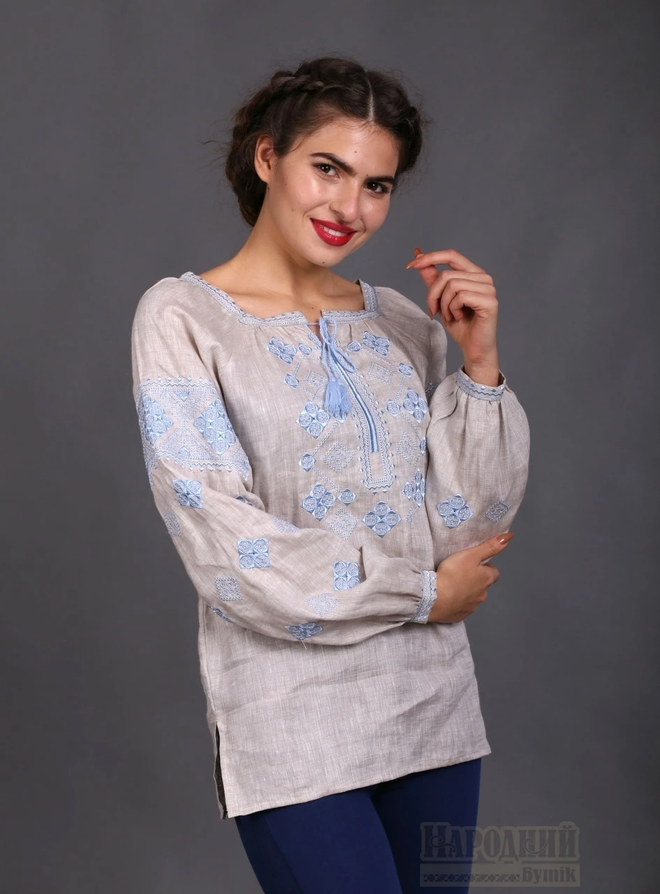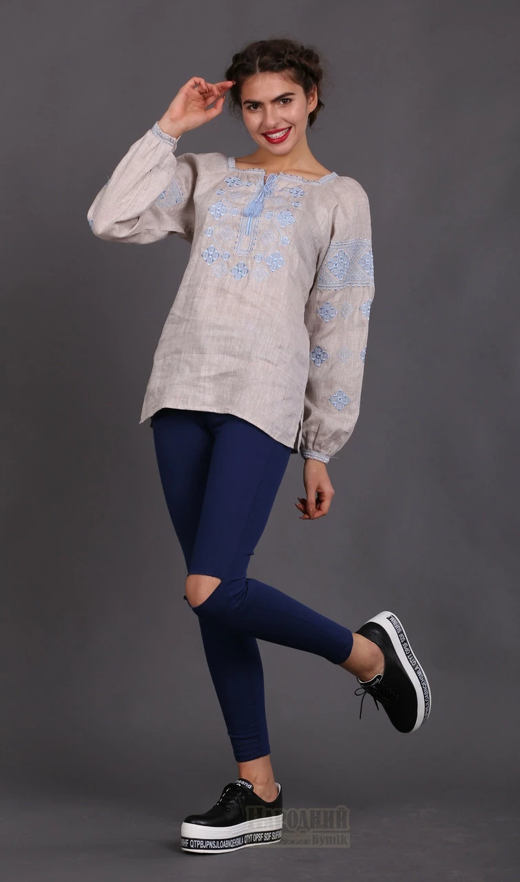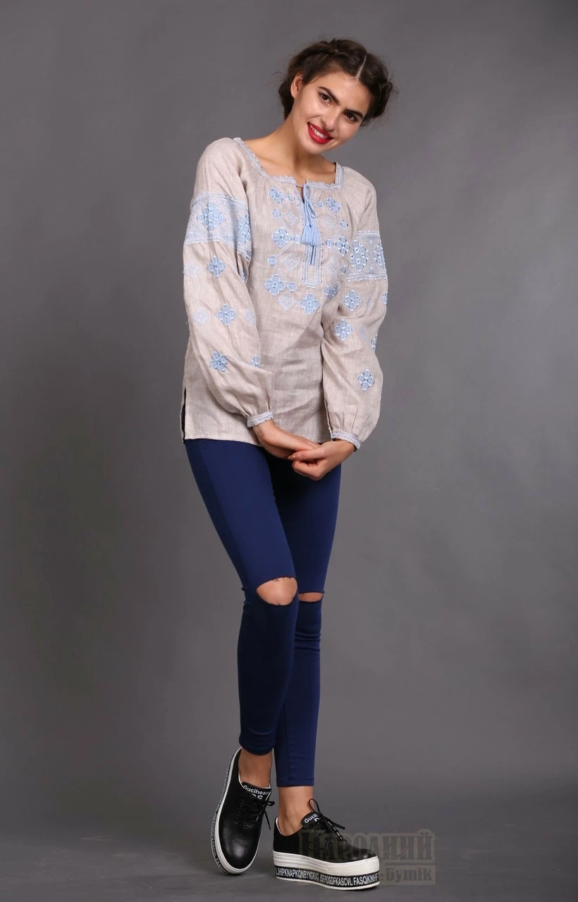 Женская вышиванка из бежевого льна и голубой вышивкой