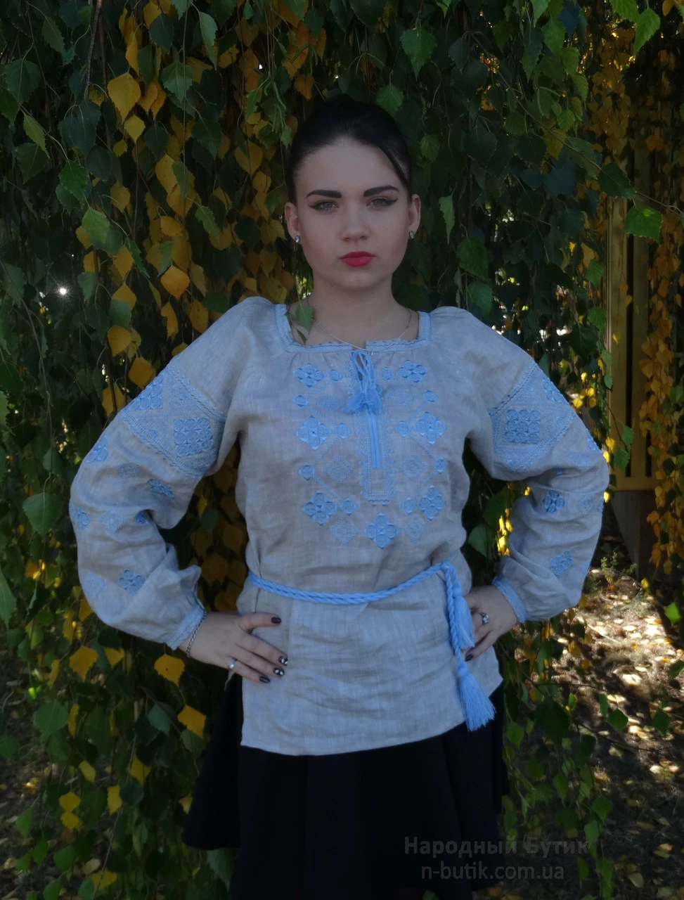 Женская вышиванка Окошко, бежевый лен, голубая вышивка, длинный рукав 52