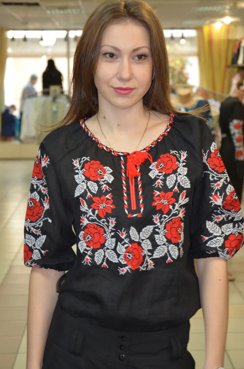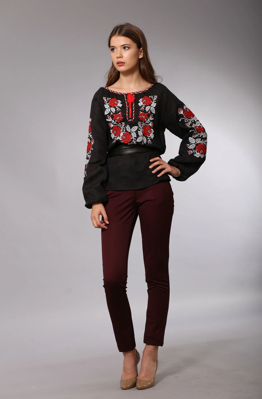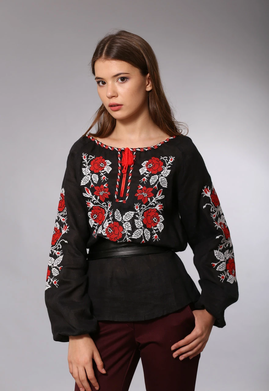 Женская черная вышиванка Полтавские Розы (красно-белая вышивка)