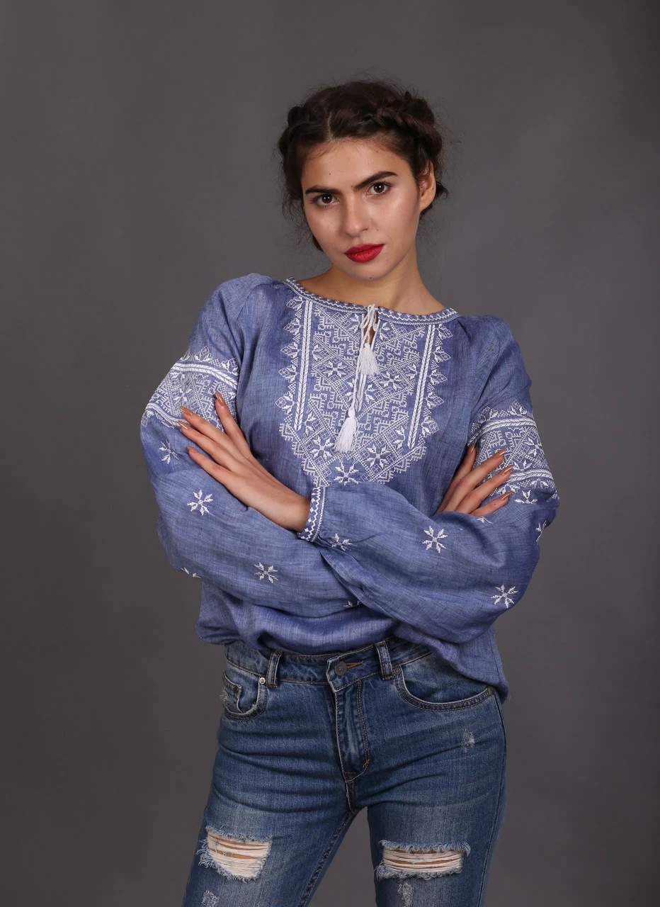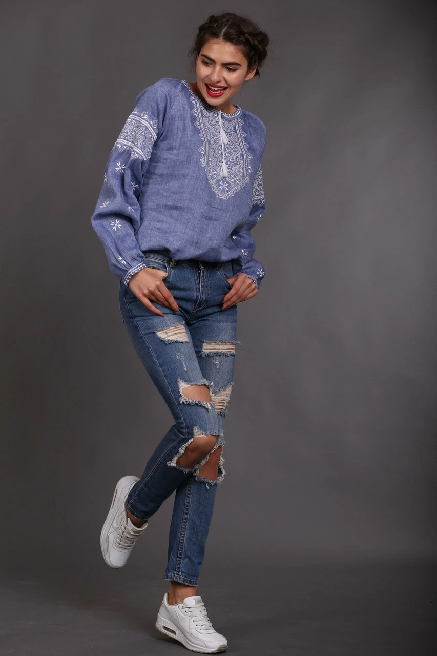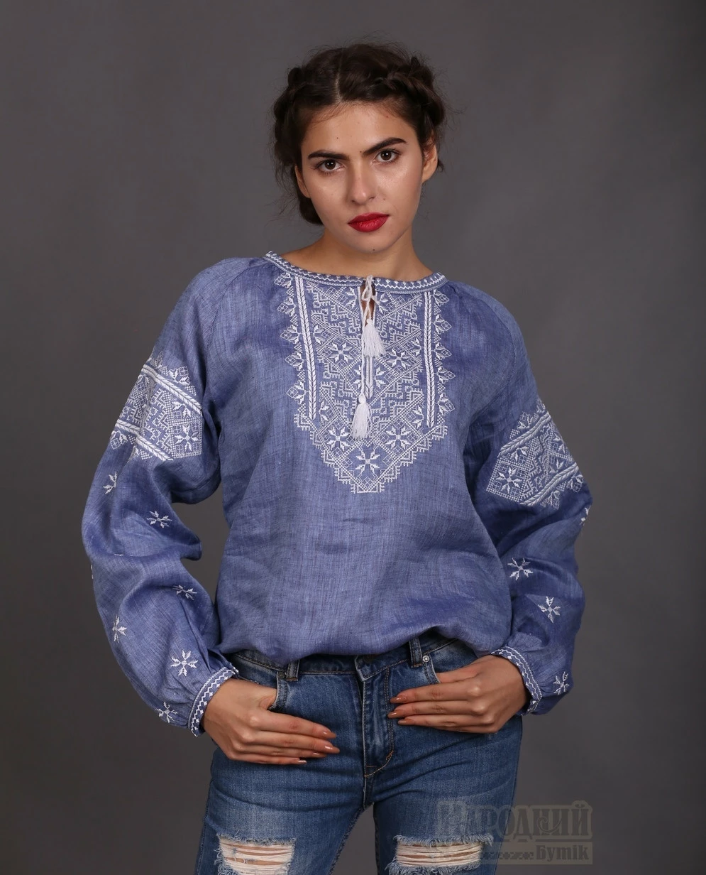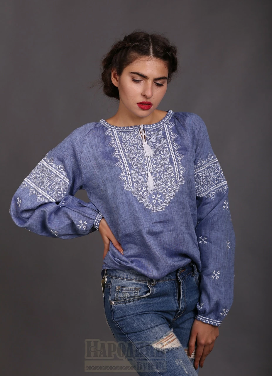 Женская вышиванка Твори мир, лен джинс, длинный рукав