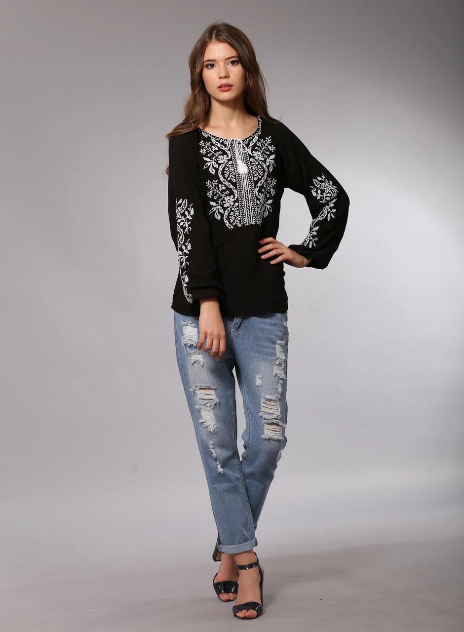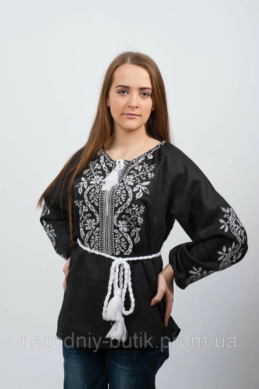 Женские вышиванки "Волна". Планка вышивки широкая с орнаментом из цветов и разнотравья.вышивка. Техника исполнения- крестик, машинная вышивка, ткань - черный штапель